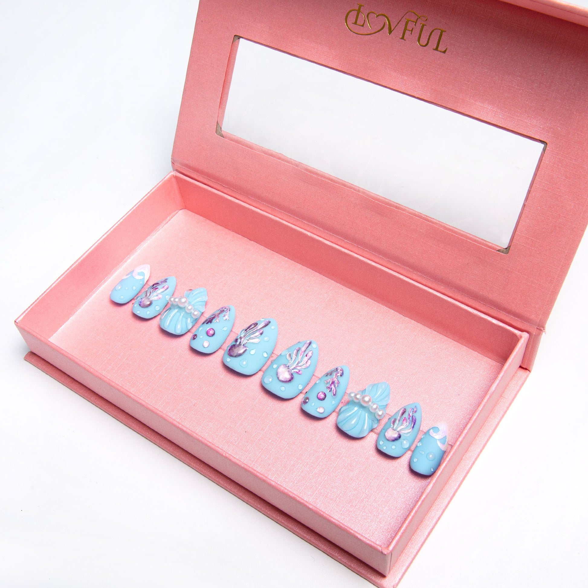 Dive into the playful charm of Lovful Press-On Nails in "Coral Rhapsody," where the vibrant spirit of an underwater paradise comes to life. Inspired by the whimsical world beneath the waves, these nails feature a radiant blue shade akin to the Pacific Ocean under the sun, perfectly capturing its warm, bright allure. Adorned with hand-drawn drops of water, lively jellyfish, and colorful corals, each design is complemented by elegant pearls that add a touch of oceanic sparkle. "Coral Rhapsody" transforms your look with a splash of fun and a nod to the enchanting beauty of the sea.
