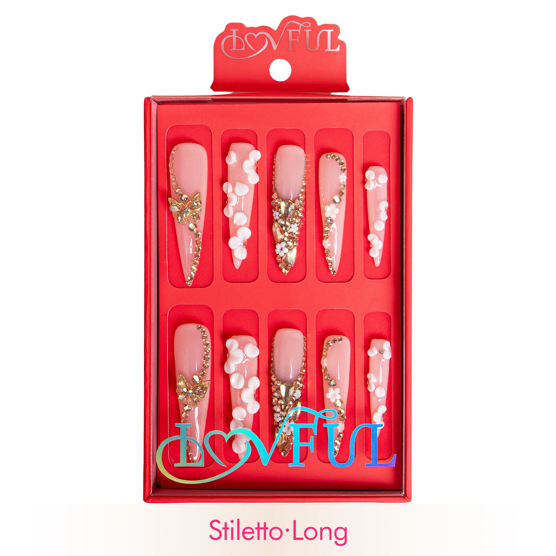 Blush bloom, a wearable work of art, unfolds a tender tale on your fingertips. The soft pink base, like the blush of dawn, cradles dainty blossoms in full bloom. And on the middle finger, a golden-embellished French tip shimmers with a touch of regal grace, transforming every gesture into an elegant poem.