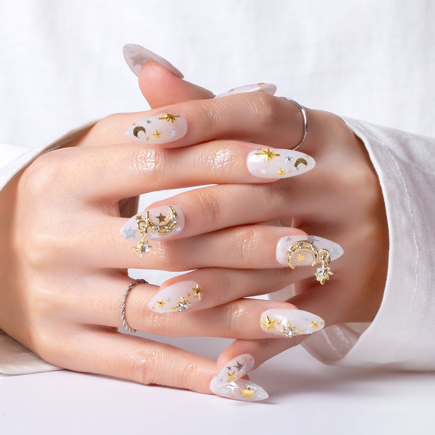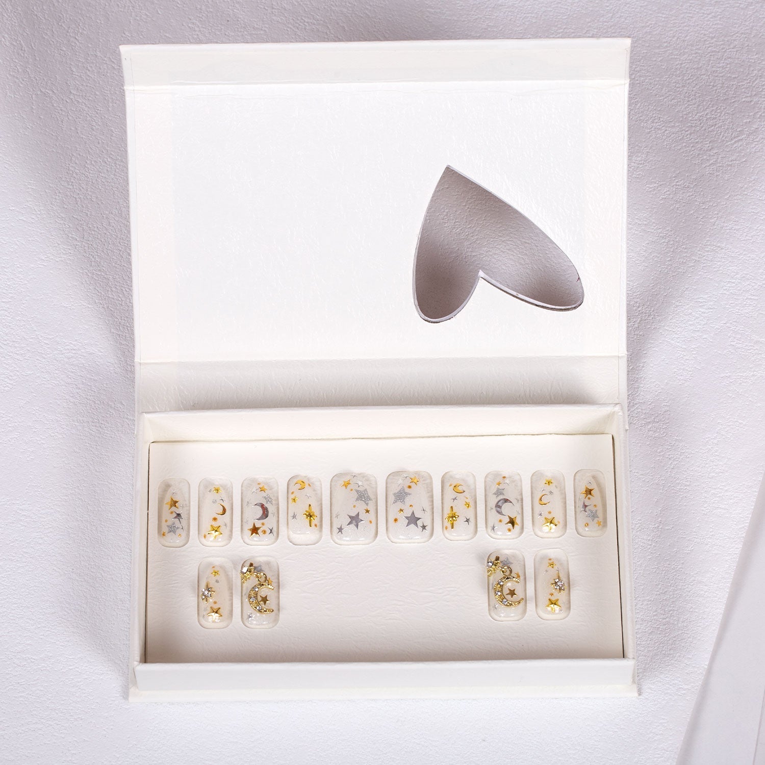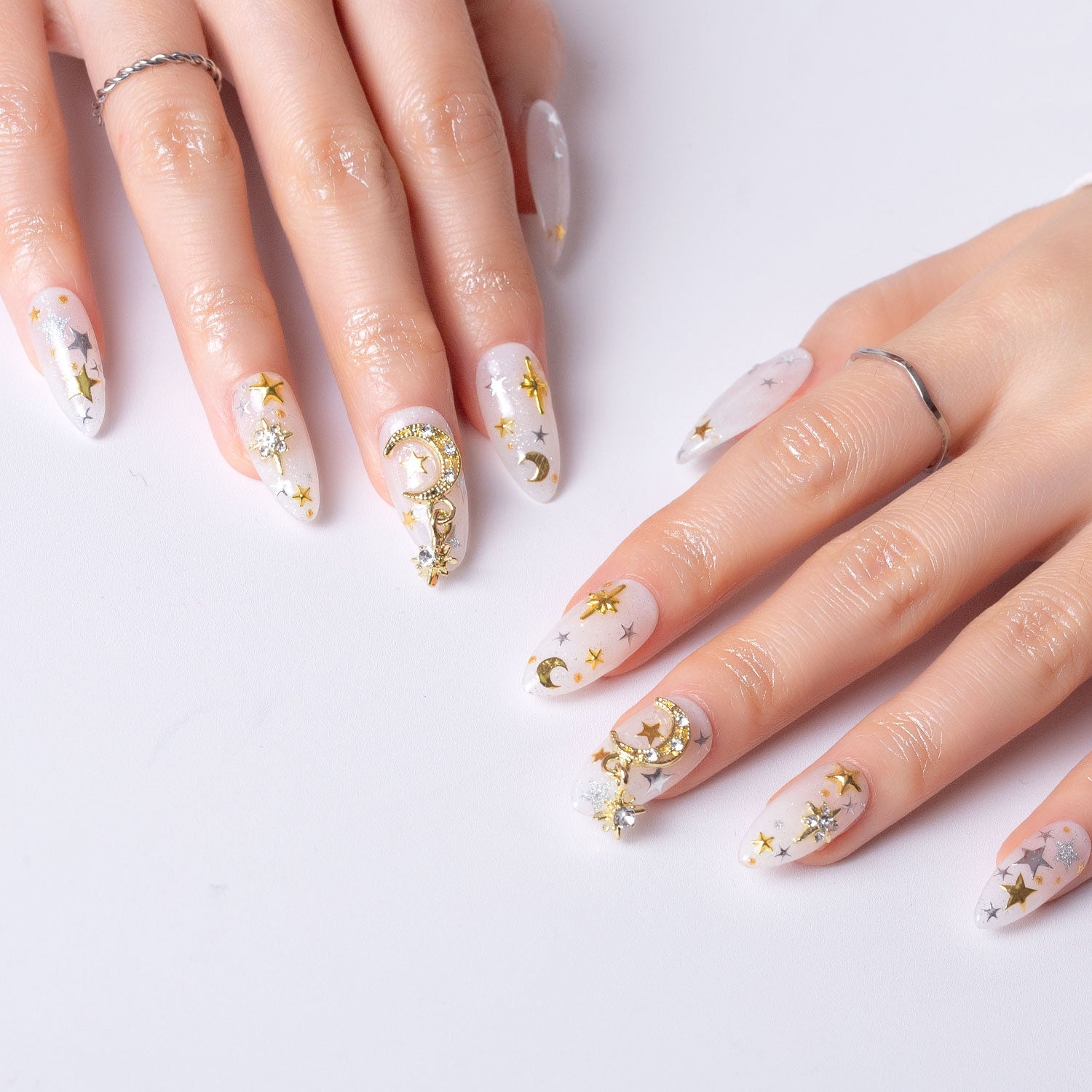 P006 Celestial Radiance features a translucent white base that showcases shimmering star accents, reminiscent of a dazzling night sky. Gold and silver stars and moons create a harmonious blend, evoking a dreamy and enchanting atmosphere that is versatile for everyday wear. No matter the setting, this nail art allows you to express elegance and individuality, as if starry light flows effortlessly from your fingertips.