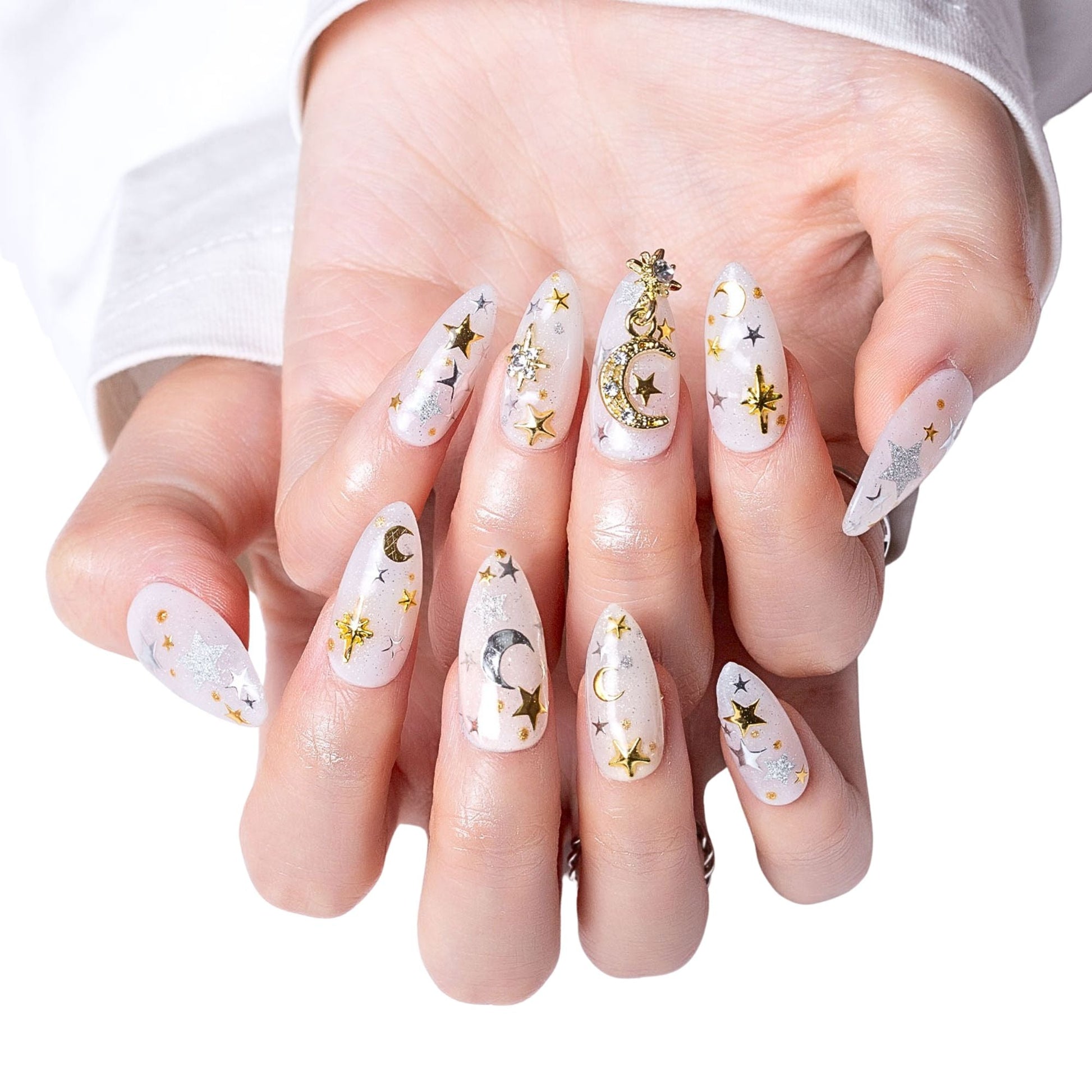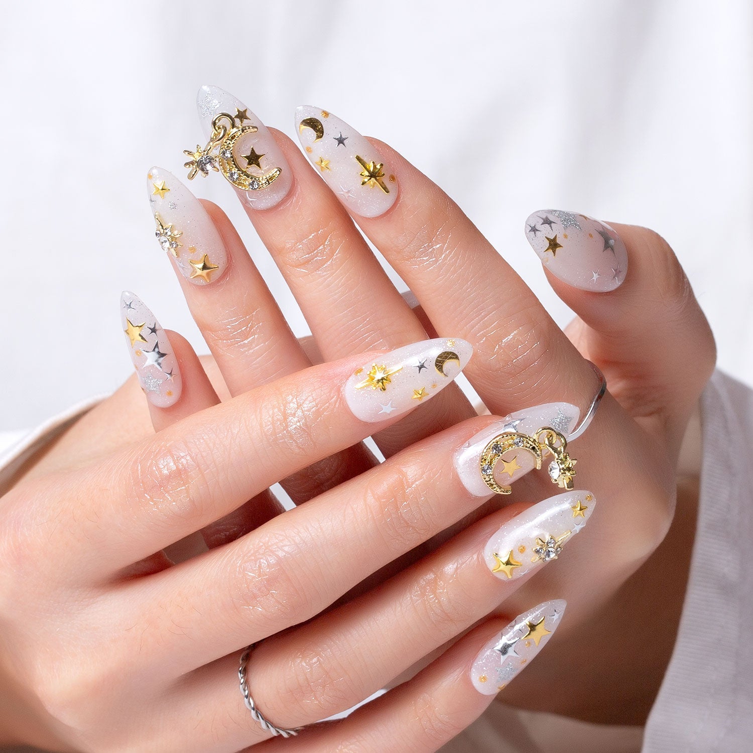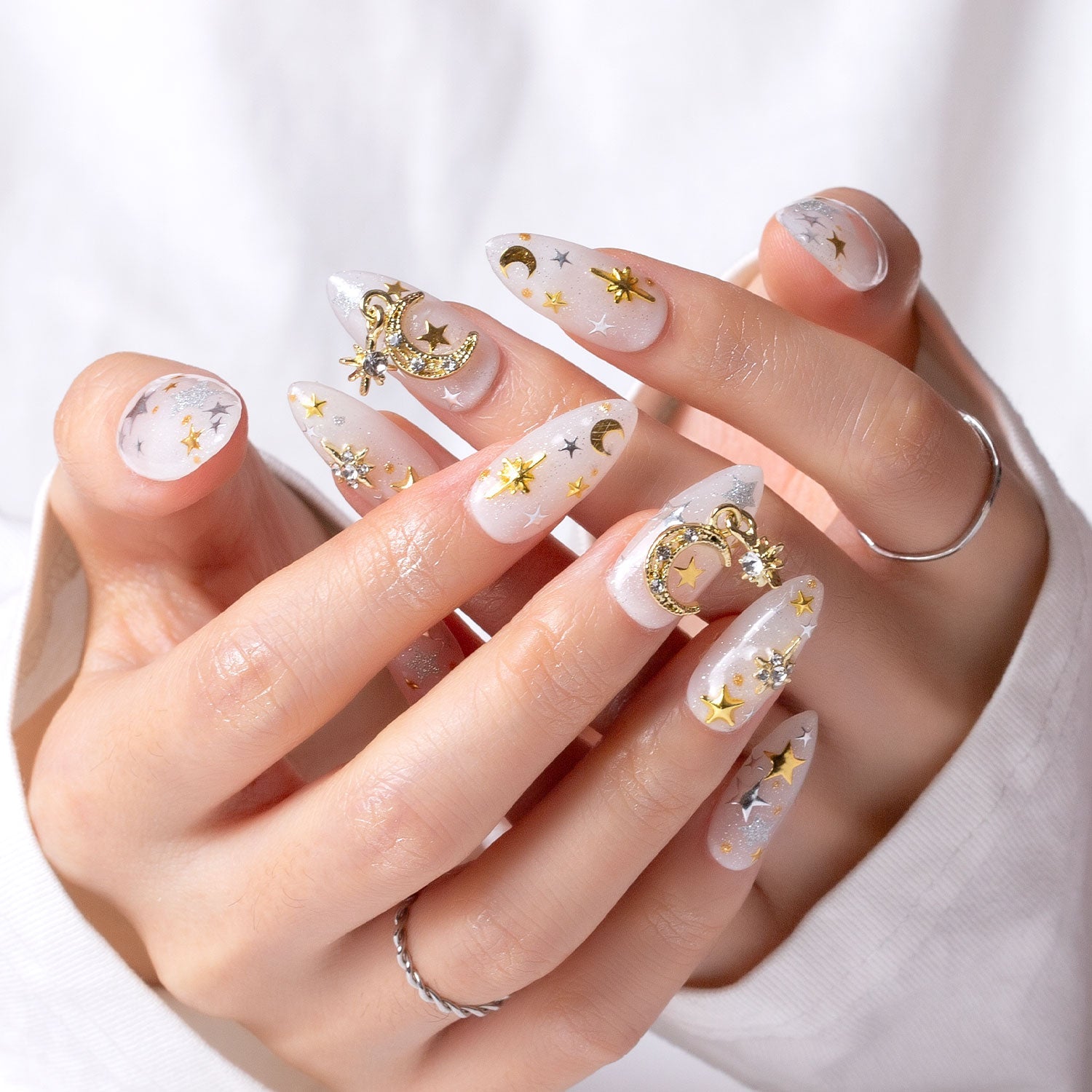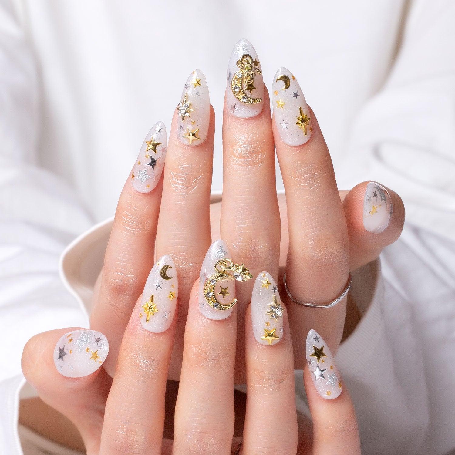 P006 Celestial Radiance features a translucent white base that showcases shimmering star accents, reminiscent of a dazzling night sky. Gold and silver stars and moons create a harmonious blend, evoking a dreamy and enchanting atmosphere that is versatile for everyday wear. No matter the setting, this nail art allows you to express elegance and individuality, as if starry light flows effortlessly from your fingertips.