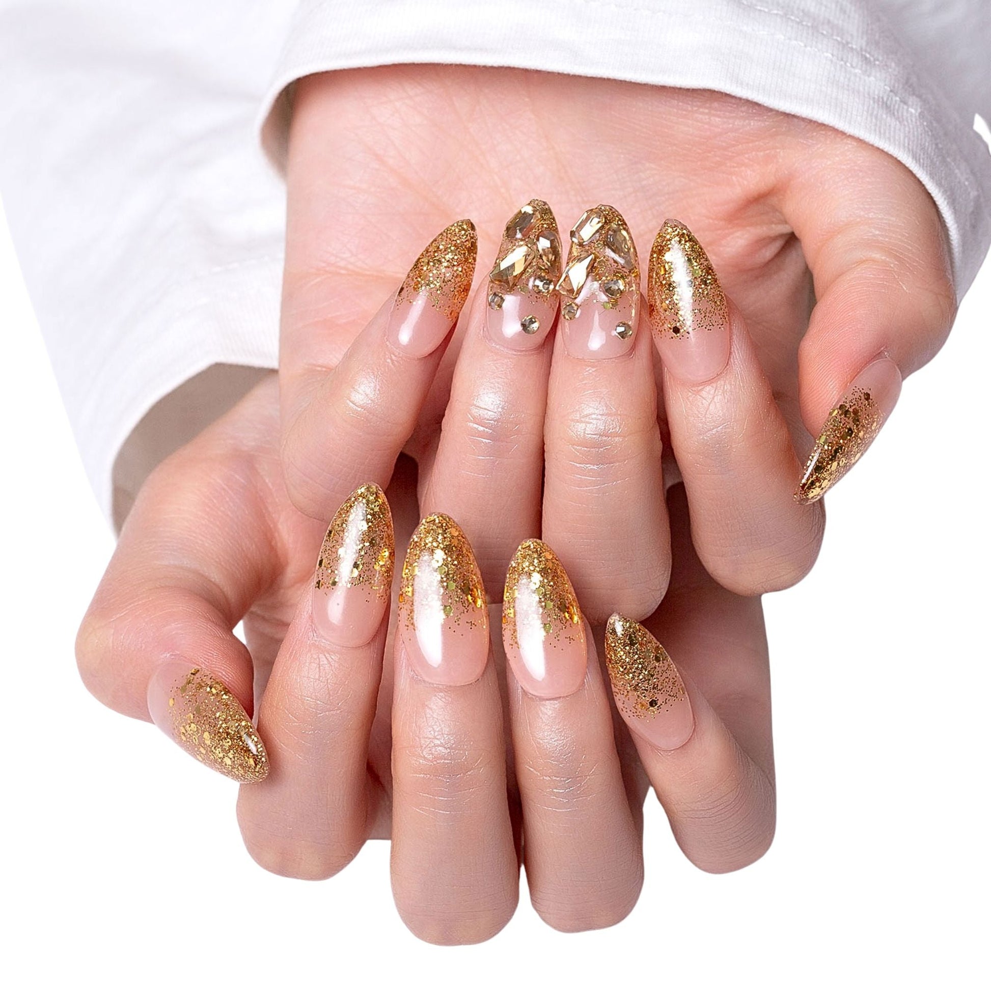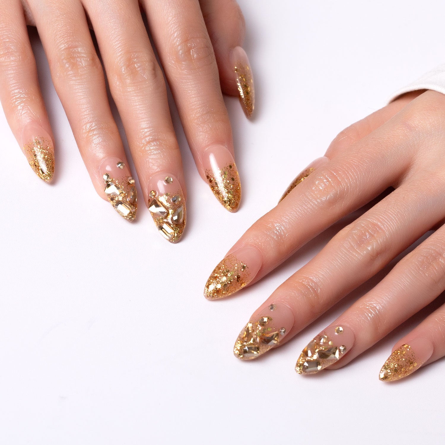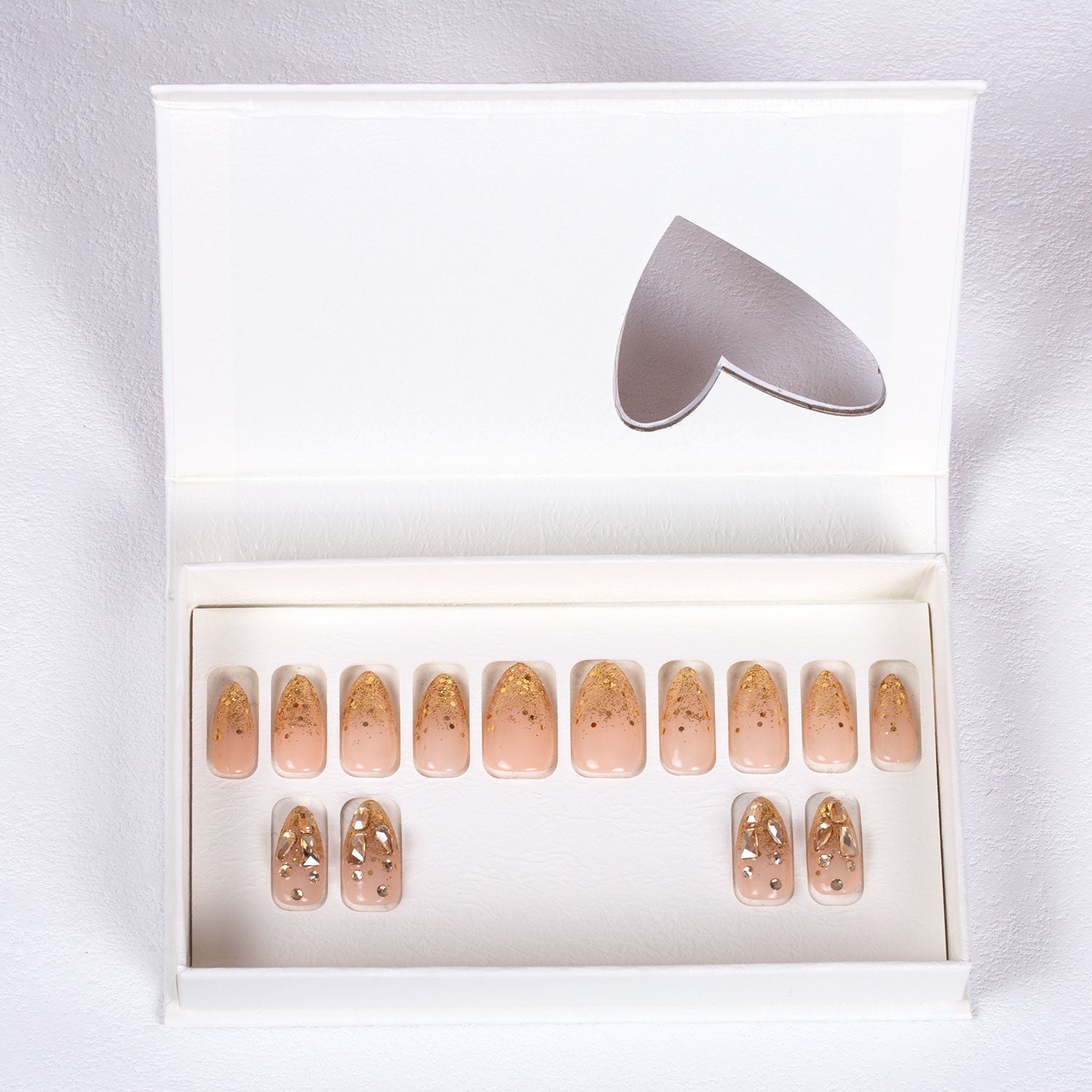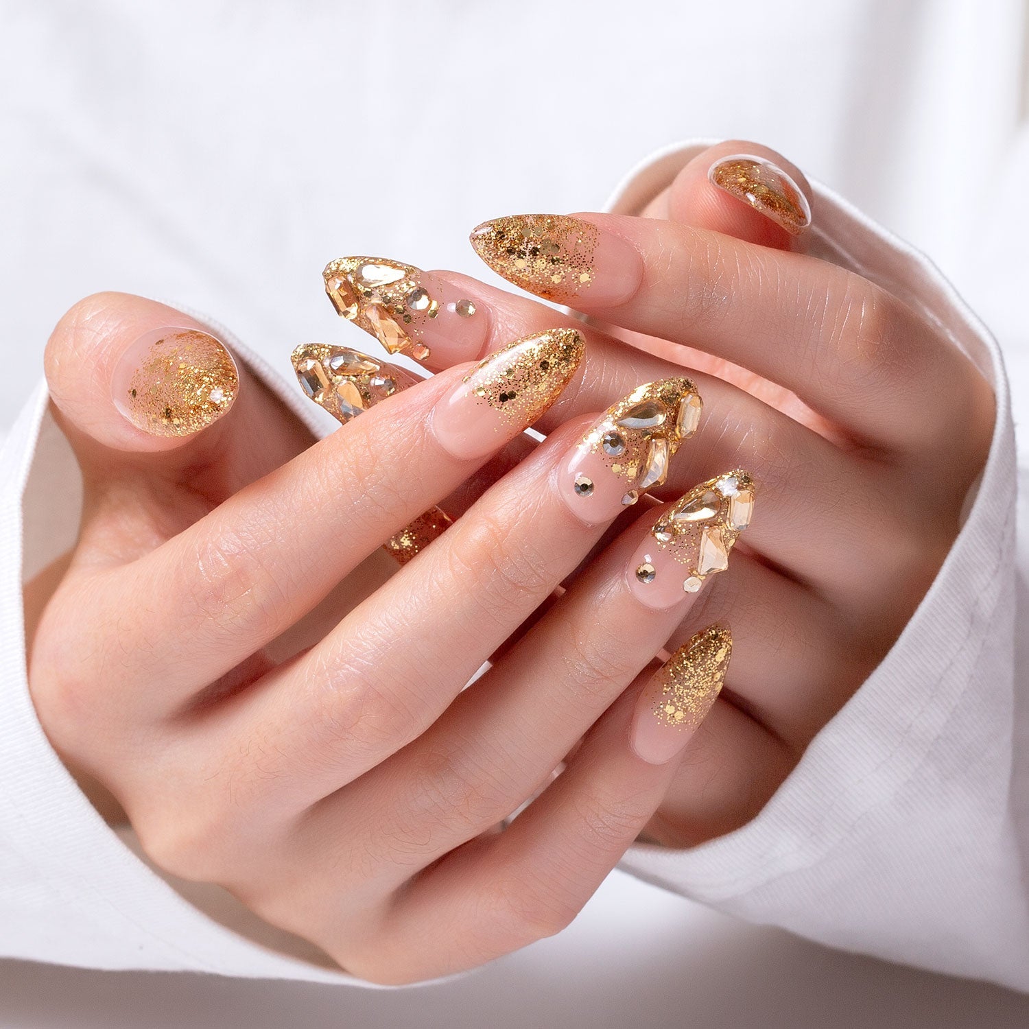 P001 Chateau Glimmer features a light pink base color, with striking gold gradually fading from the tips to the nail bed, resembling sunlight cascading onto your fingertips and exuding an enchanting glow. Upgraded pieces are adorned with varying sizes of gold rhinestones, adding a dazzling touch of luxury and individuality. The overall design is vibrant and glamorous, blending fashion with artistry, making every gesture radiate confidence and charm.
