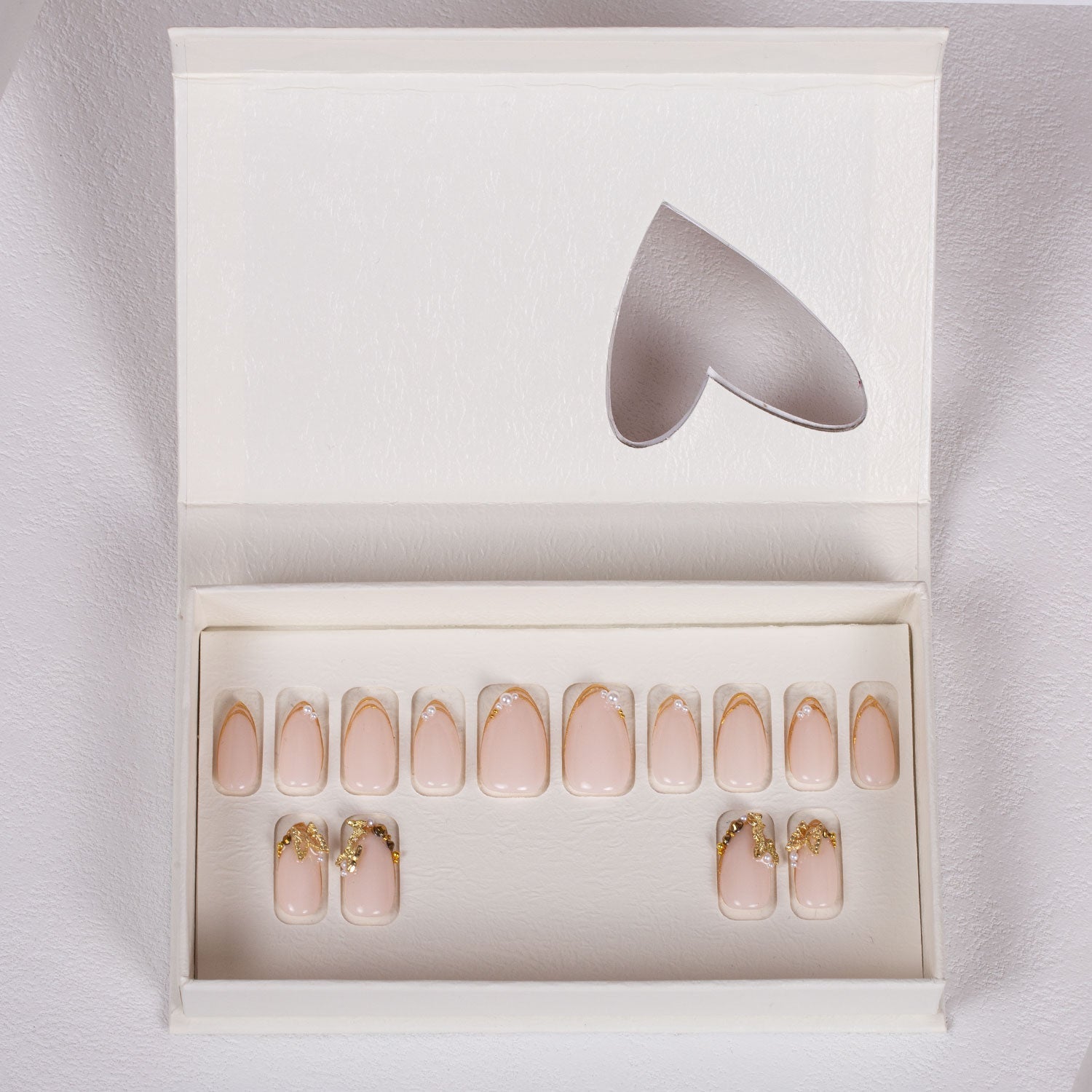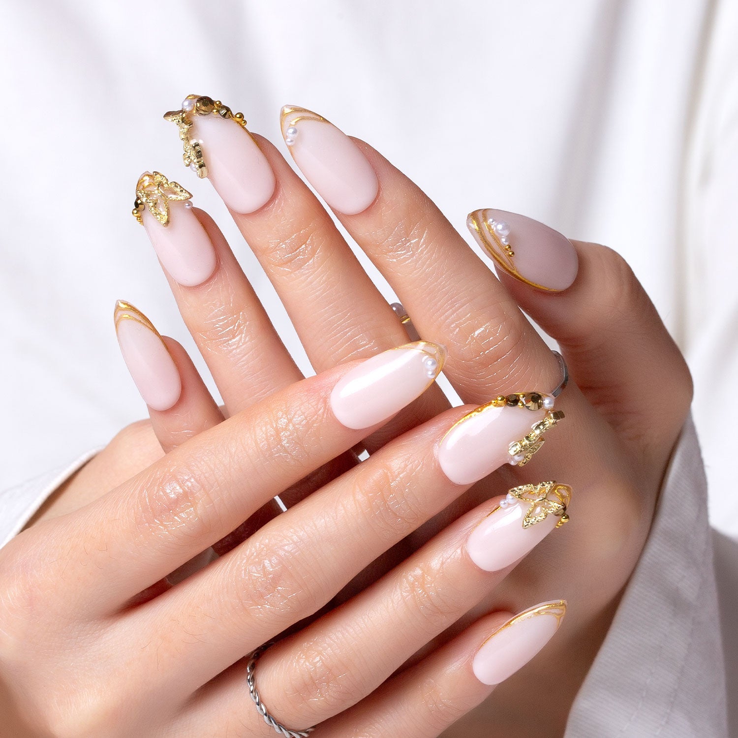 P007 Gilded Glam features a translucent white base paired with gold mirror pink, creating a captivating metallic sheen that exudes a light luxury vibe. The overall look is versatile yet distinctive, allowing you to showcase confidence and sophistication at any moment.Delicate white pearls are sprinkled throughout, adding a touch of elegance and refinement, making it perfect for everyday wear.