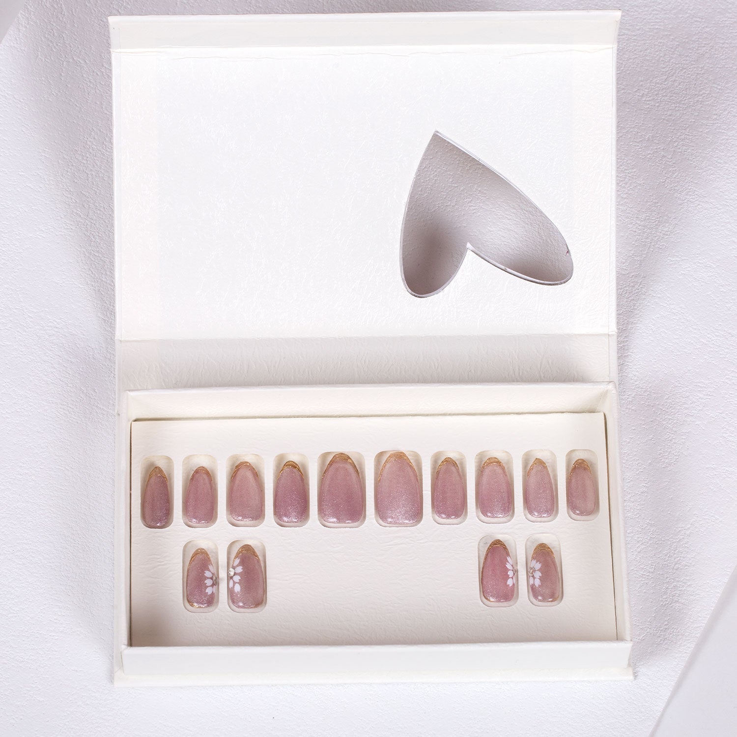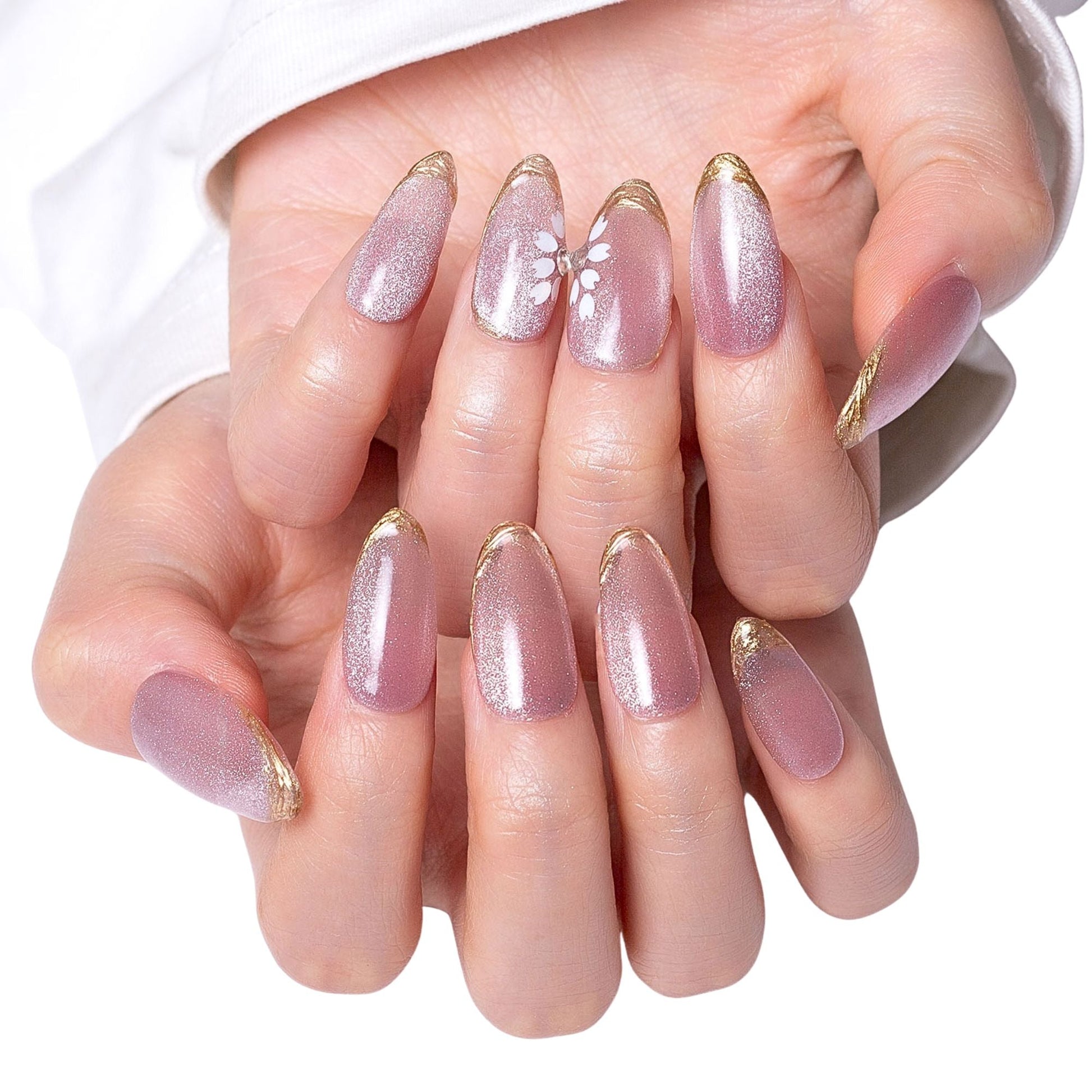 P004 Golden Finesse features a translucent pink base that showcases a dazzling and dynamic cat eye effect, shimmering beautifully in the light. The champagne-colored French tips have a textured appearance reminiscent of silk wrapping around the nails, adding an elegant and luxurious touch. Delicate petal accents adorn the nail surface, creating a soft and romantic atmosphere. The overall design radiates femininity and grace, making it perfect for both everyday wear and special occasions. This nail art allows you to exude elegance and confidence effortlessly.