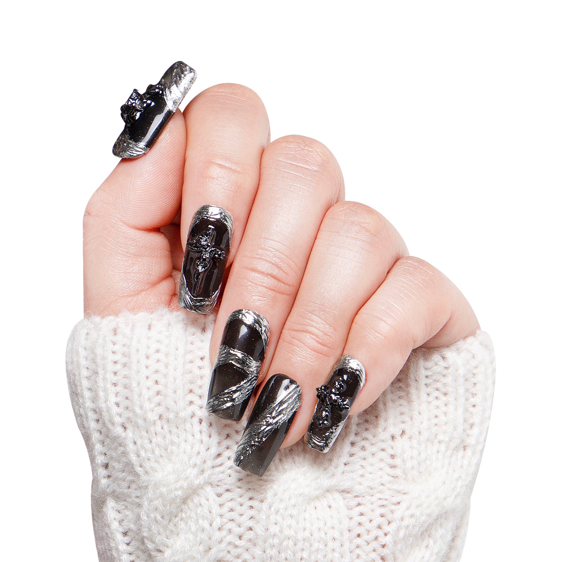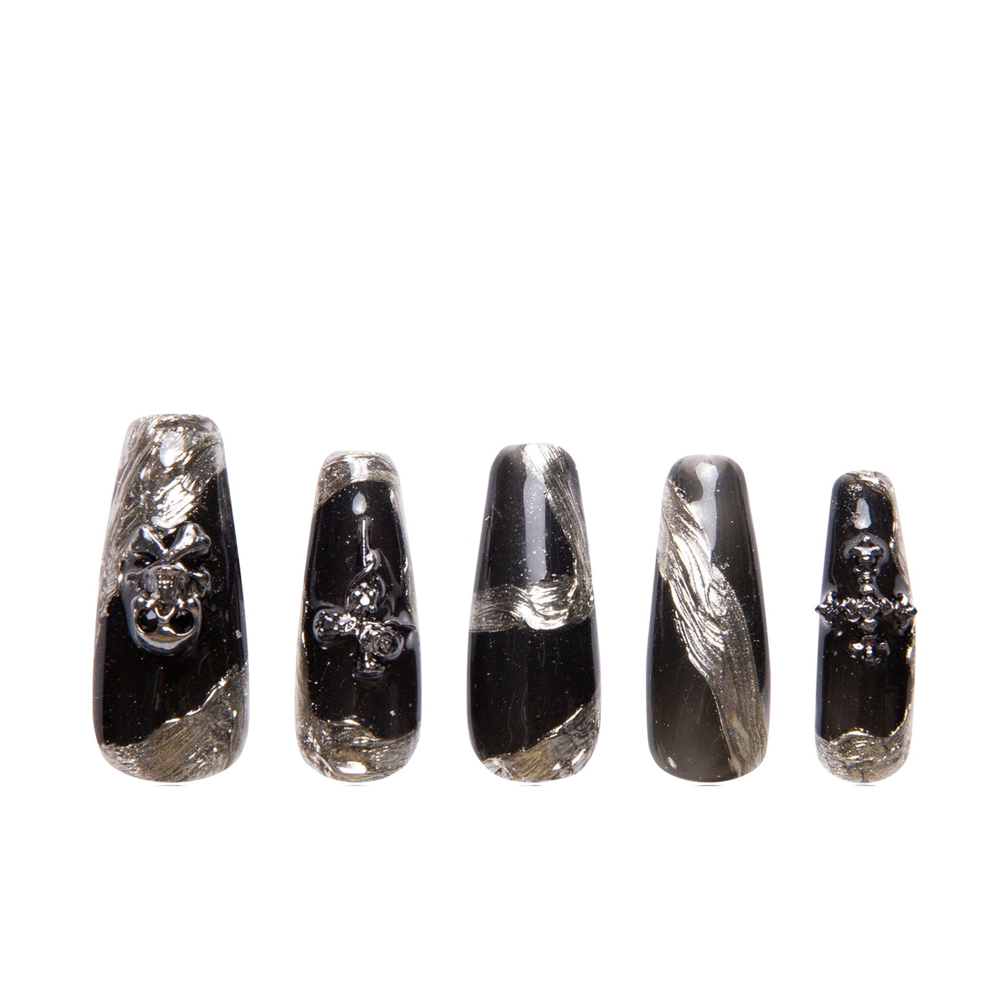 Introducing The Edge by Lovful: a bold and edgy press-on nail set designed to make a statement. Featuring a sleek black base adorned with hand-drawn silver liquid-like waves, skulls, and crosses, these nails exude a cool, punk, and spooky vibe. Perfect for those who dare to push boundaries and embrace their unique style, The Edge combines high-quality materials with striking design elements for a look that's as durable as it is eye-catching. Unleash your inner rebel with Lovful's The Edge press-on nails.