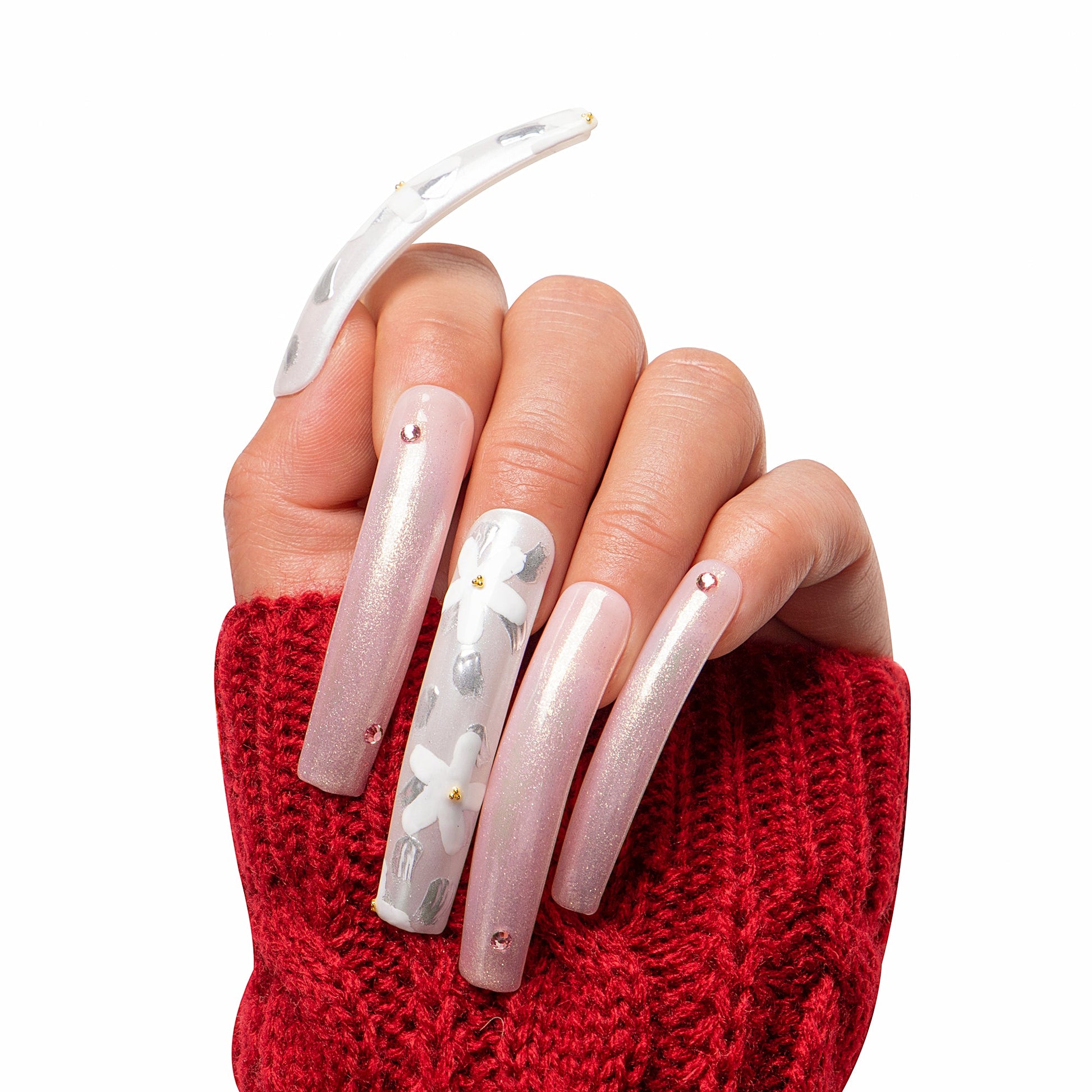 The nails feature a delicate pink base, softly enhanced with pink shell powder to create a warm, glowing halo. White flowers and subtle silver paint add a touch of purity and freshness, evoking the image of blossoms glowing softly in the snow. Perfect for those who appreciate understated beauty and timeless elegance, Flower in Snow nails offer a tranquil and eternal charm, making your manicure a serene and captivating statement.