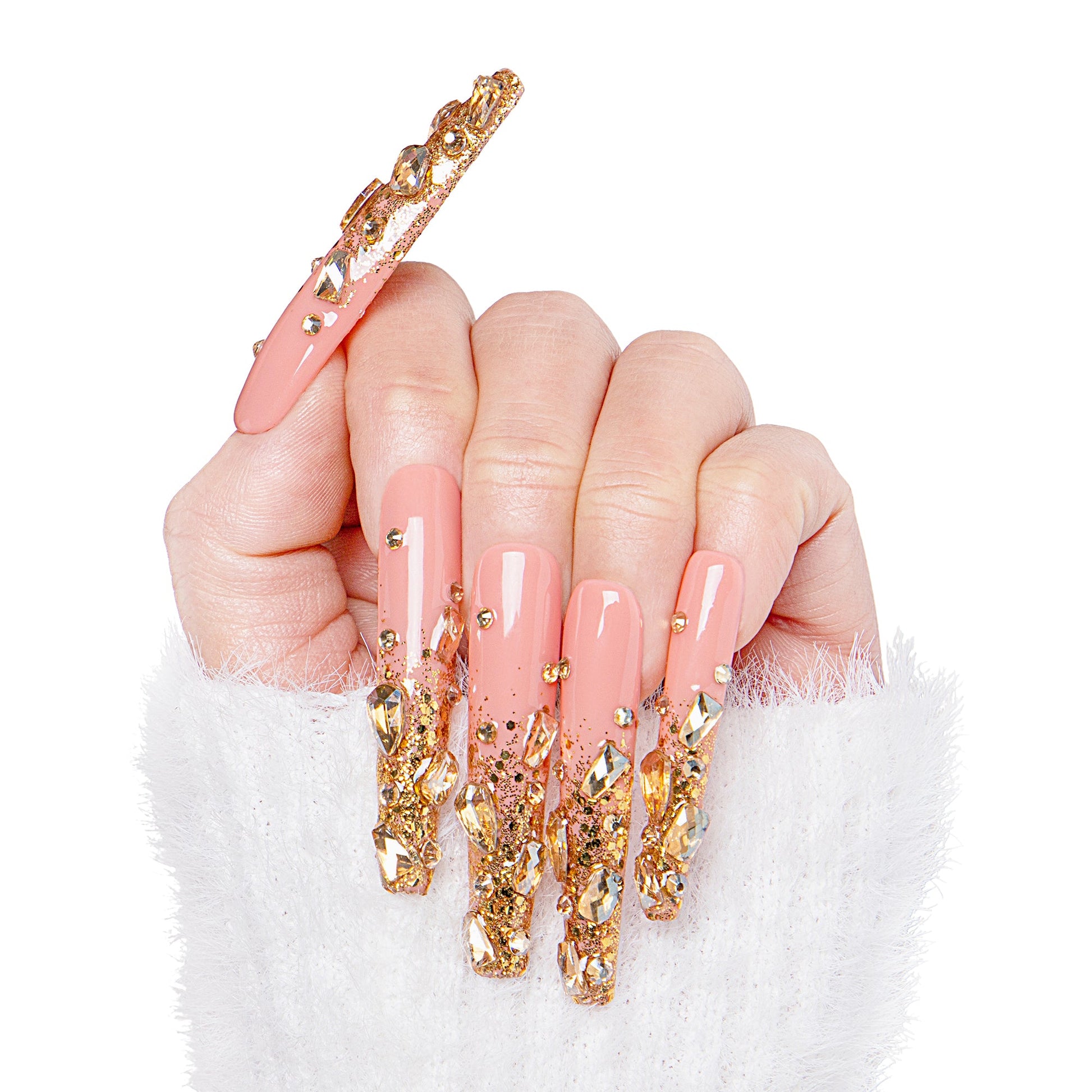 Discover the captivating charm of H84 Stardust, where each finger transforms into a gilded work of art. Boasting dazzling French tips resembling a sunrise in a royal abode, these nails radiate richness and magnificence. Glittering like the stones above, they add a touch of enchantment to your hands, conjuring a spell of captivating beauty that captures admiration and awe.