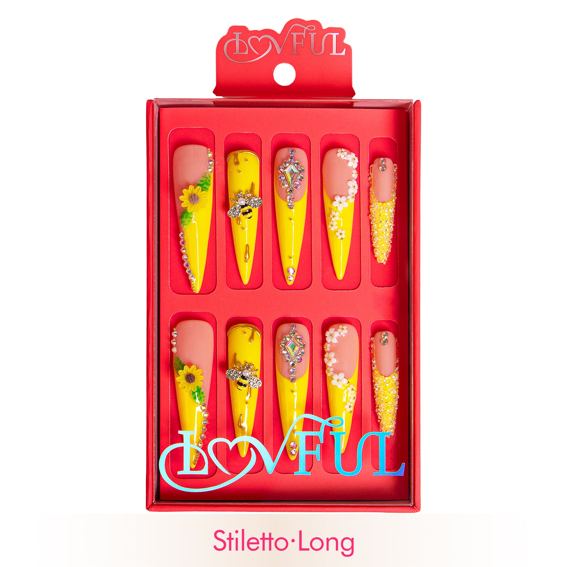 Introducing the "Honey Bee" press-on nail set by Lovful, a delightful blend of nature's charm and sweet elegance. This pastoral-inspired design features vibrant sunflowers, symbolizing enthusiasm and positivity, paired with adorable bee decorations that represent the sweetness of life. The nails also showcase a unique flowing honey design that adds a touch of whimsy. The bright yellow hue throughout the set exudes warmth and passion, making your fingertips look irresistibly sweet and inviting. Perfect for adding a touch of sunshine to your day!