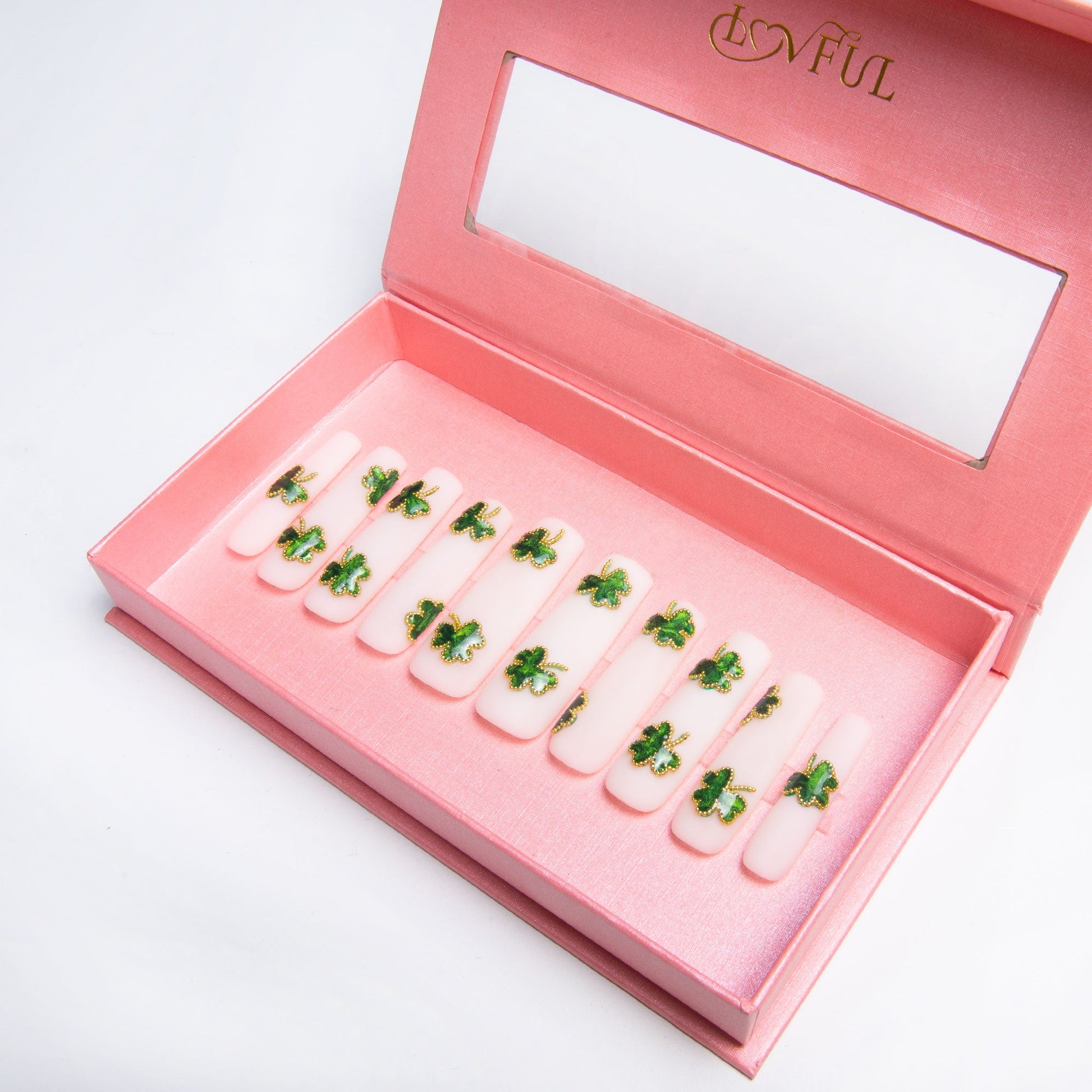 Introducing ''Lucky Charm'' a Lovful press-on nail set that brings a touch of fortune to your fingertips. Featuring a delicate milk white base adorned with tiny shamrocks, this design exudes simplicity and elegance. Each nail is a subtle yet stylish symbol of good luck, perfect for those who believe in the magic of a lucky charm. Whether you're stepping into a new opportunity or just want a daily reminder of positivity, these nails are your perfect companion.