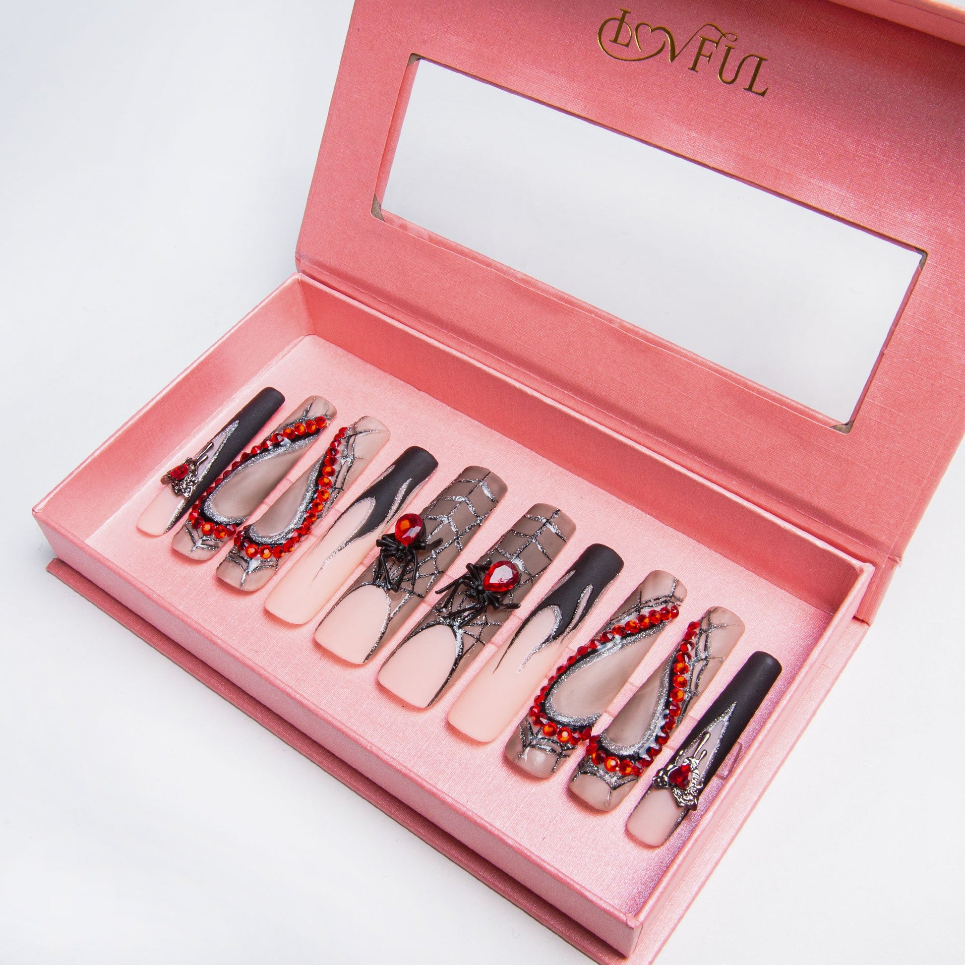 Lovful's "Midnight Spiderweb" press-on nail set strikes the perfect balance between elegance and darkness. With a nude base as the backdrop, the intricate black spiderweb designs weave across each nail, creating a mysterious and edgy vibe. Red gemstones add a bold contrast, infusing the look with a touch of rebellious glamour that?¡¥s perfect for those who love a darker, gothic aesthetic.