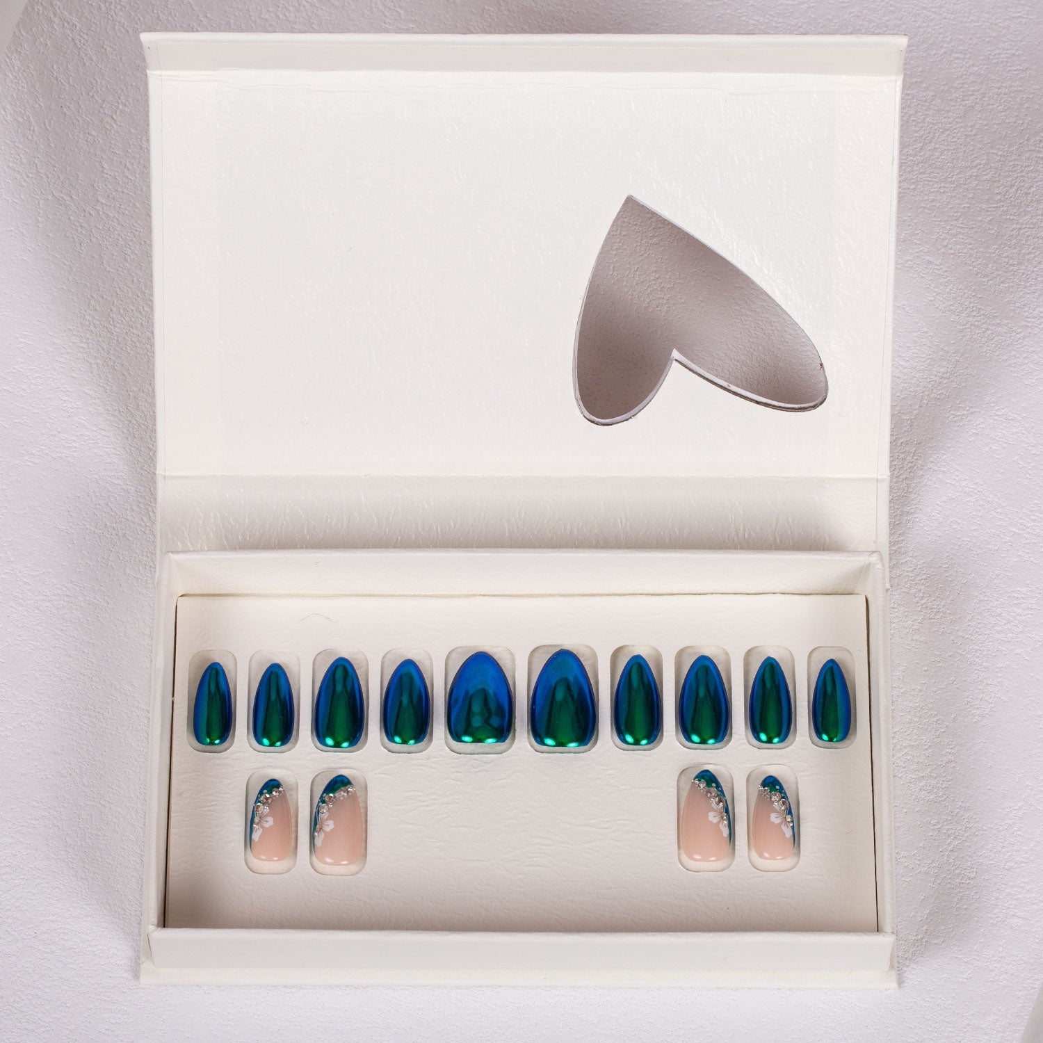 P008 Opulent Allure features a stunning metallic sheen with captivating blue-green undertones that shimmer beautifully in the light. The delicate white petals add a touch of softness and elegance, creating a look that is both grand and refined. Perfect for the autumn and winter seasons, this design is versatile enough for everyday wear. Whether in a work or casual setting, these nails will effortlessly showcase your unique charm, blending fashion and individuality seamlessly.