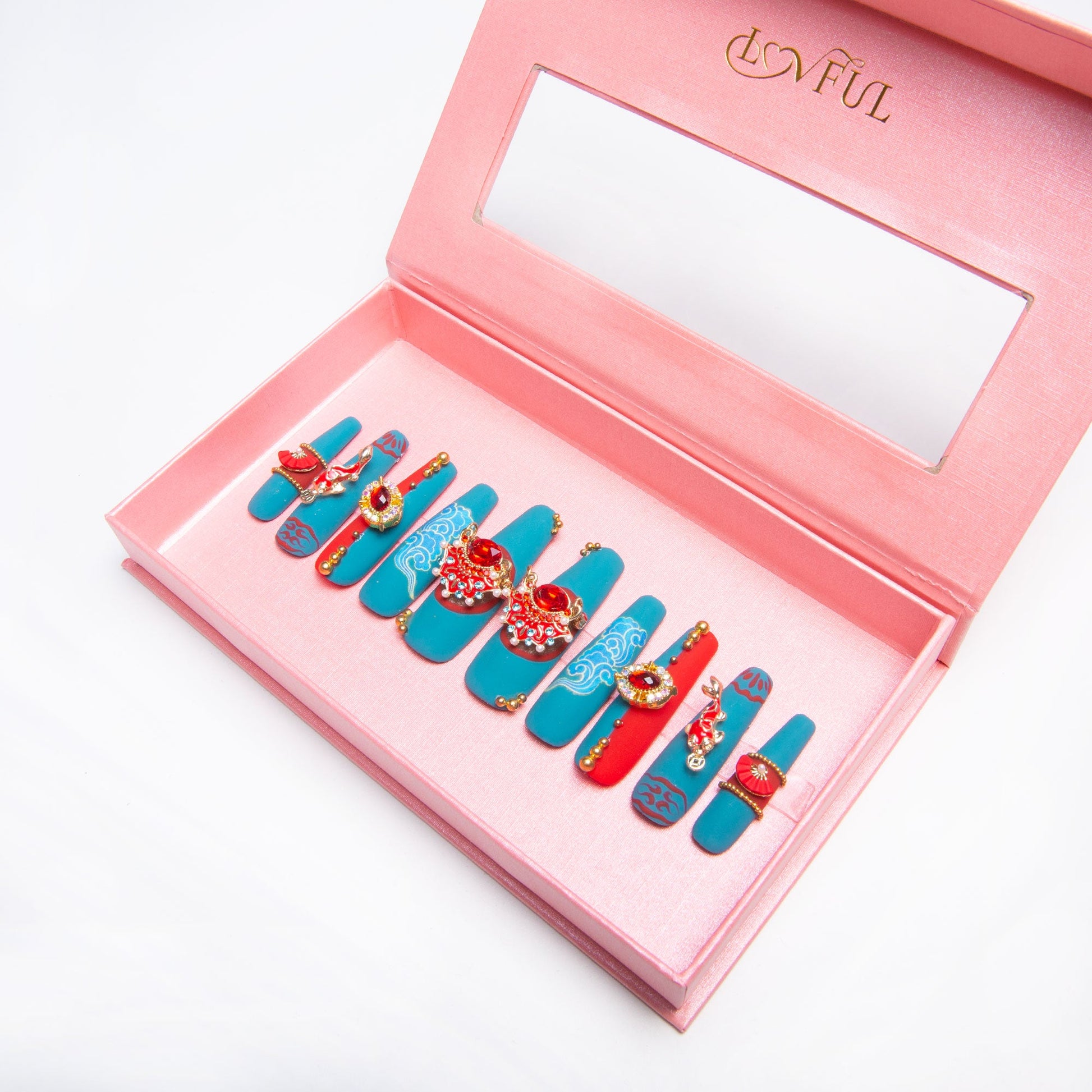 "Oriental Dream" is a stunning fusion of deep blue and vibrant red, inspired by the rich traditions of the East. Each nail captures the essence of oriental beauty, featuring iconic elements like the regal Peking opera red headwear, graceful auspicious clouds, and the timeless folding hand fan. Perfect for those who want to embrace cultural artistry with a touch of modern flair, "Oriental Dream" is your ticket to a stylish journey through time and tradition.