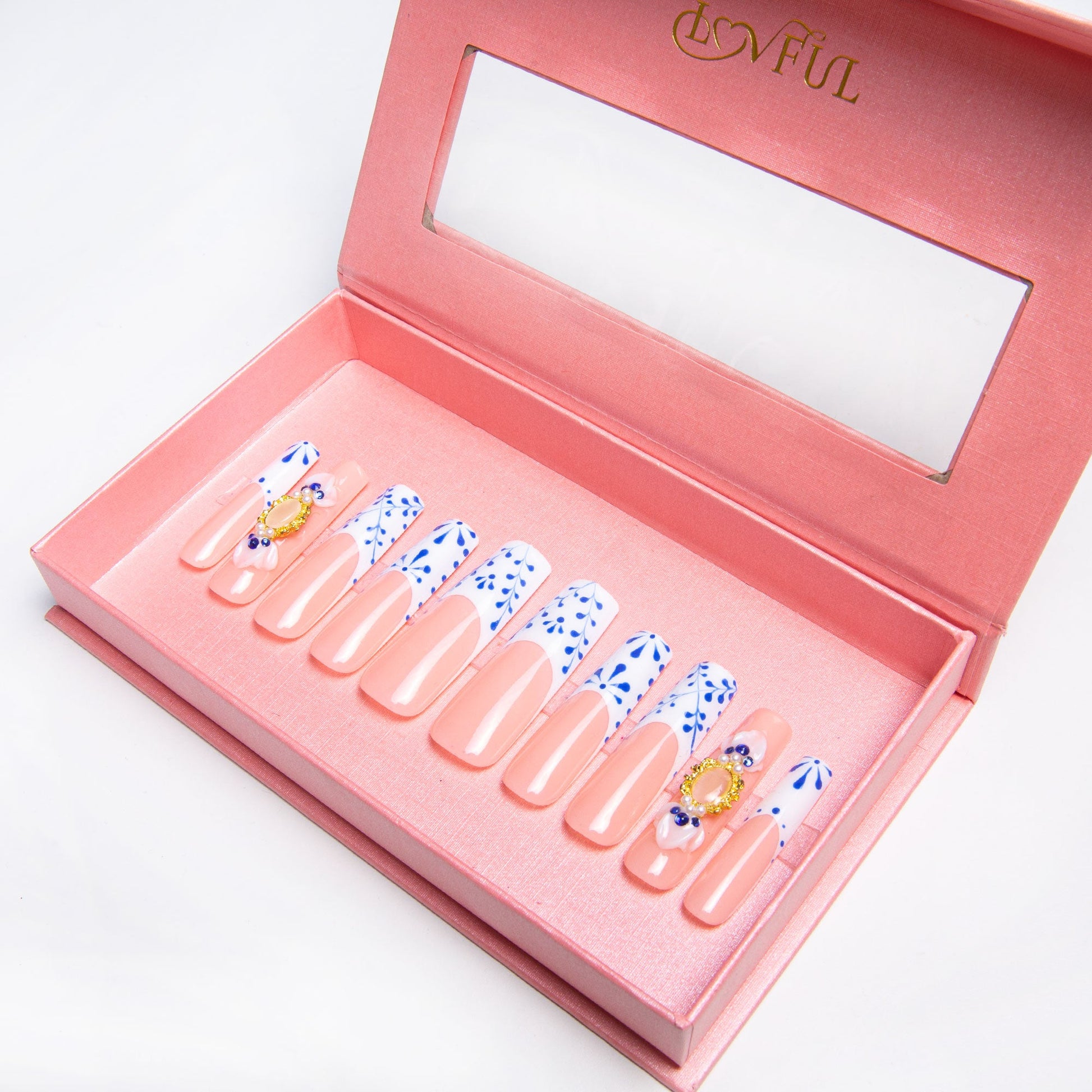 Introducing Lovful's Porcelain Blue Press-On Nails, a sophisticated blend of elegance and tradition. These nails feature a classic Chinese style with a modern twist, showcasing a French tip delicately adorned with intricate Chinese prints. The Porcelain Blue color exudes a timeless charm, complemented by delicate floral patterns and a striking, jewel-like accent on the ring finger. Perfect for any occasion, these press-on nails offer a touch of luxury and cultural artistry, making them an exquisite addition to your nail art collection.