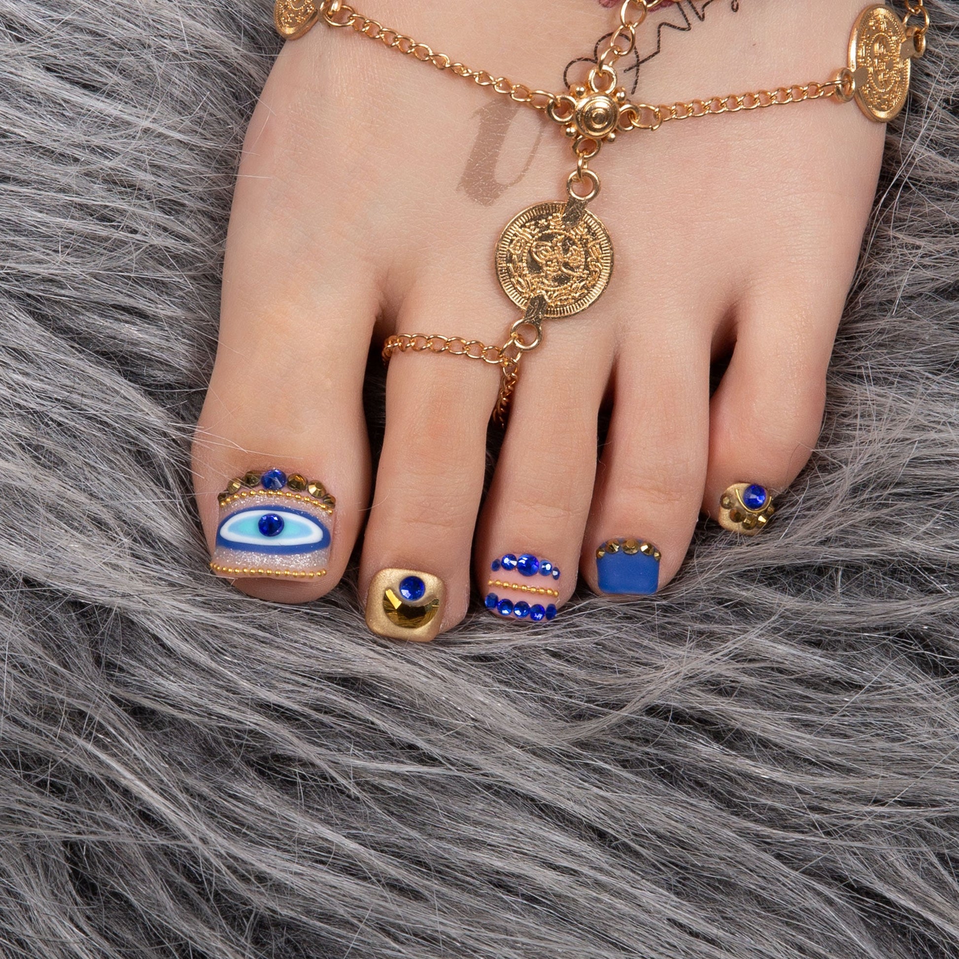 Introducing "Spiritual Beacon" Press-On Nails, a captivating collection inspired by the ancient symbol of the evil eye. Adorned with shimmering golden accents and sapphire blue gems, each nail embodies the essence of protection, warding off misfortune, and inviting good luck. This design represents strength, wisdom, and a connection to the spiritual, making it more than just a fashion statement and it's a talisman for those who seek to illuminate their path with positivity and grace. Let Spiritual Beacon be your shield, combining beauty with powerful symbolism in every exquisite detail.