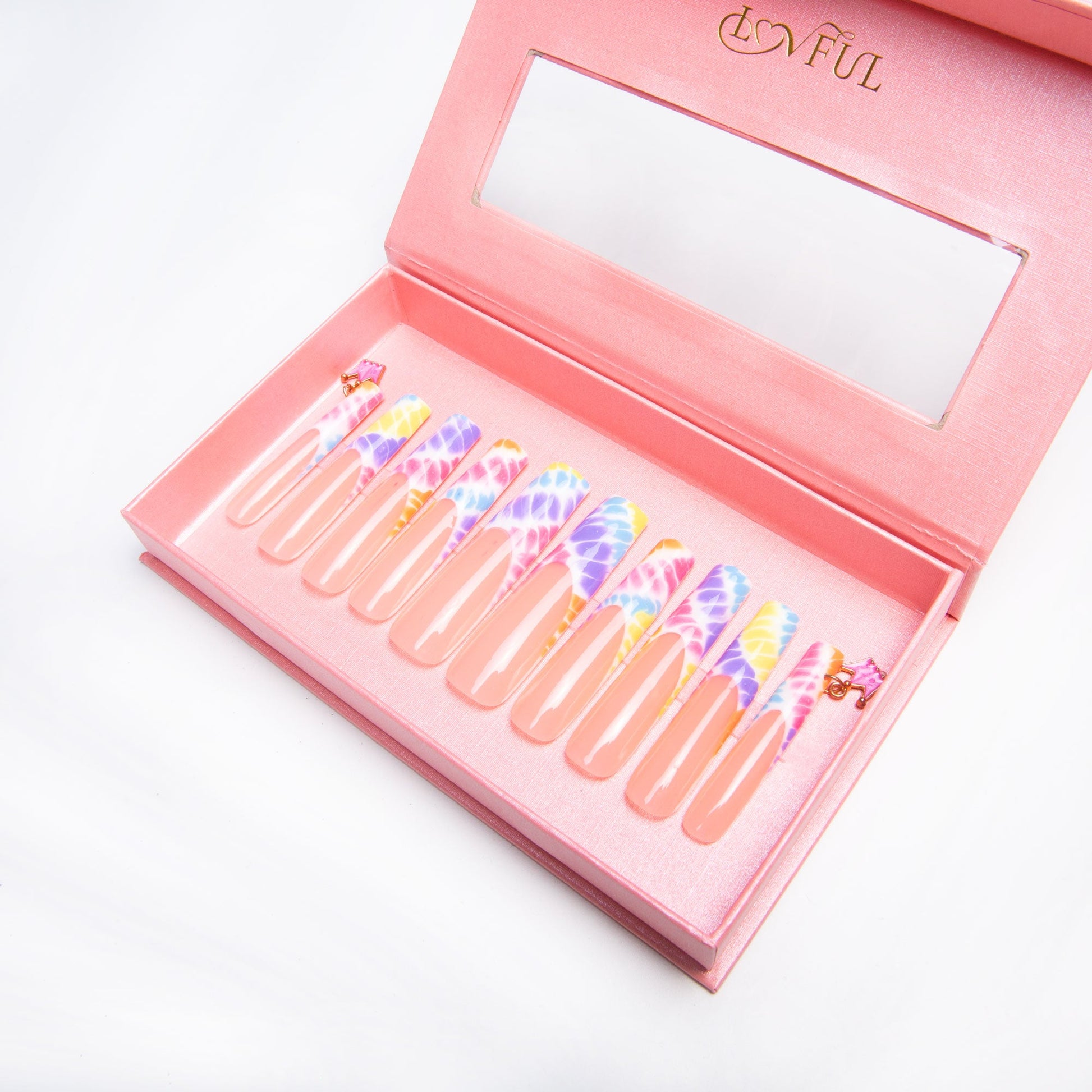 Summerfest features a pink base color. The French tips are designed in a multicolored, rainbow-like appearance, which is extremely eye-catching and full of vitality. On the little finger, there is an adorable little crown as a decorative charm, adding a touch of cuteness and elegance to the whole set of nails. It is a perfect combination of fashion and delicacy, making your fingertips look more charming and unique.