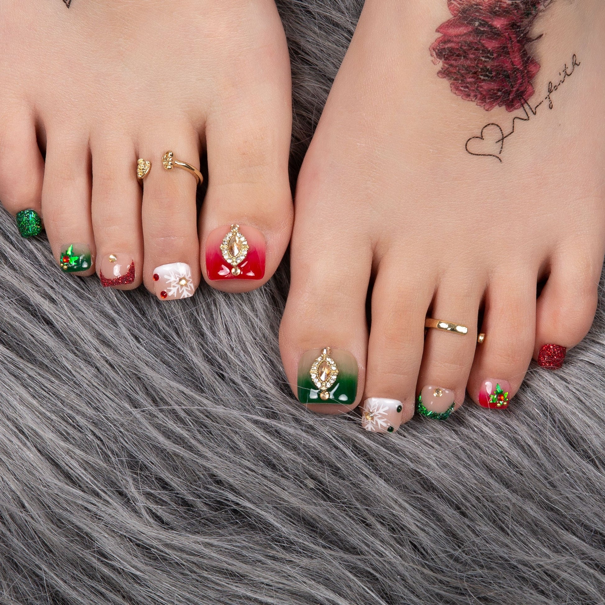 Twinkling Pines beautifully captures the joy and charm of the holiday season. Featuring vibrant Christmas tree green and dazzling neon red as the main colors, each nail shines like a festive gem. The sparkling red rhinestones resemble twinkling holiday lights, casting a warm festive glow, while the luxurious gold rhinestone on the thumb serves as the crown jewel, elevating the entire design to new heights. The delicate accents of green leaves and pristine snowflakes evoke the wonders of winter, adding a refreshing and lively touch. Perfect for parties or gatherings with loved ones, this nail set enhances your allure and confidence, making you the shining star of any holiday celebration.