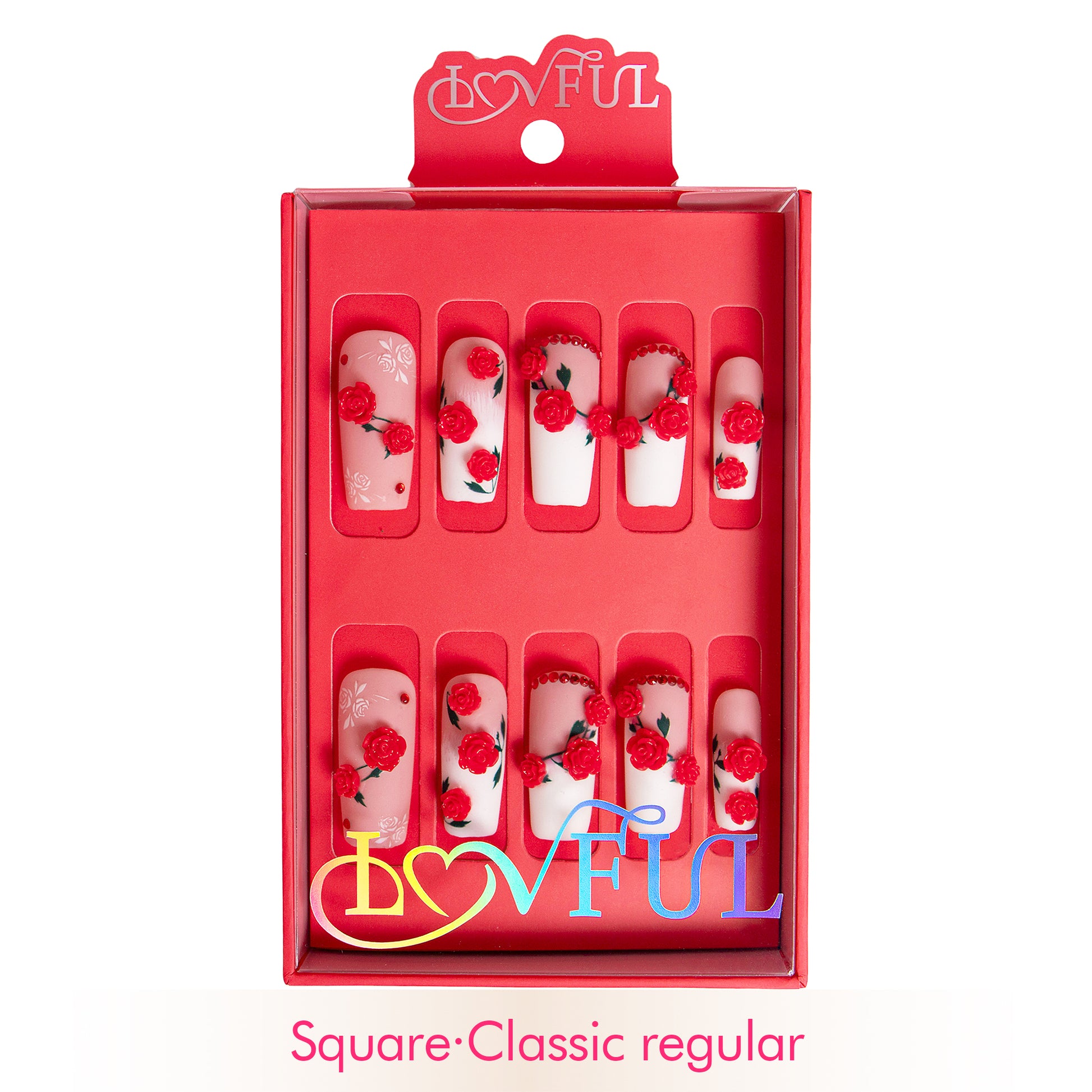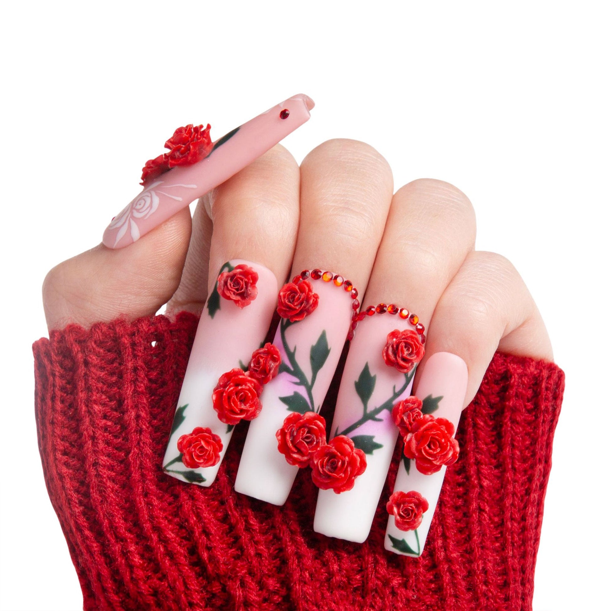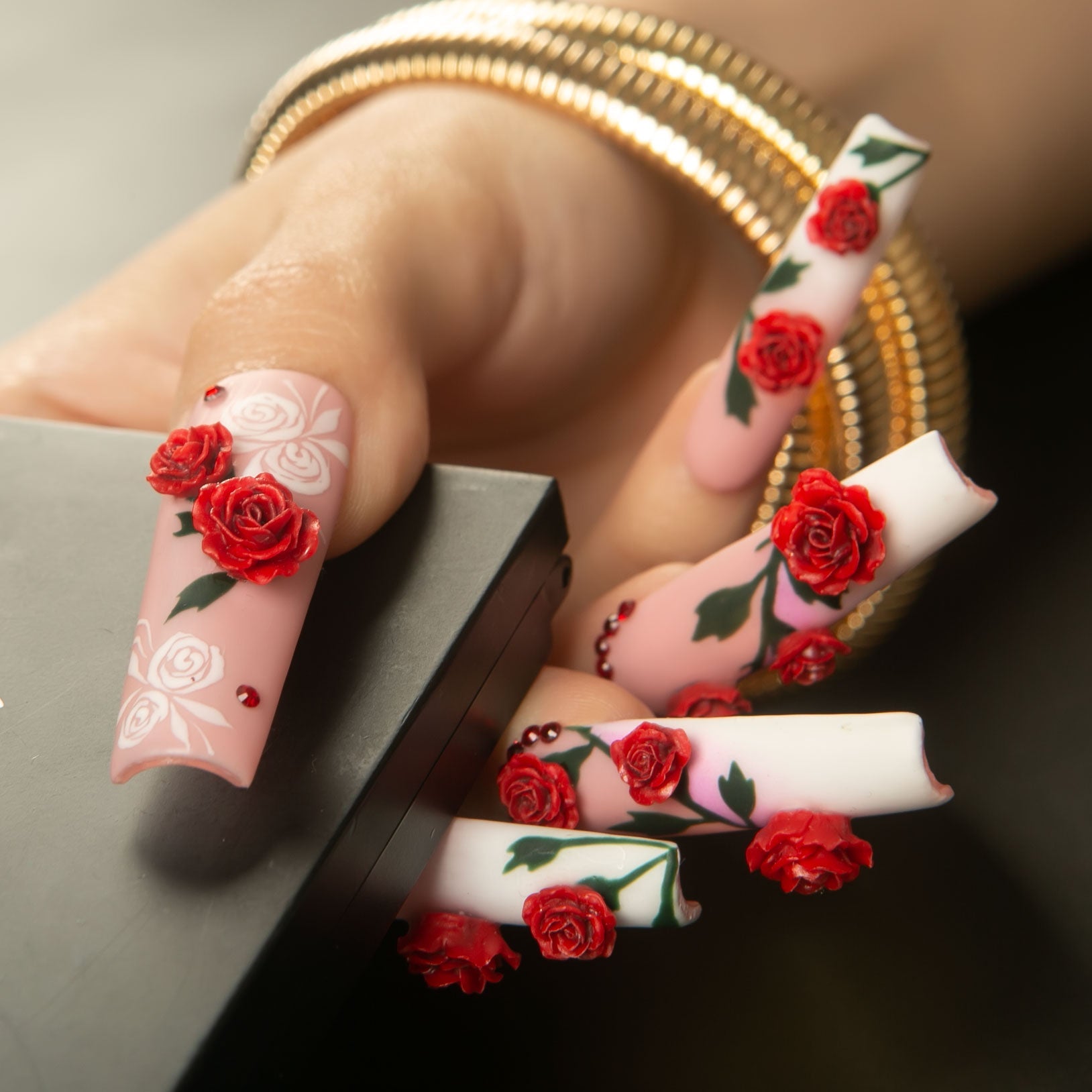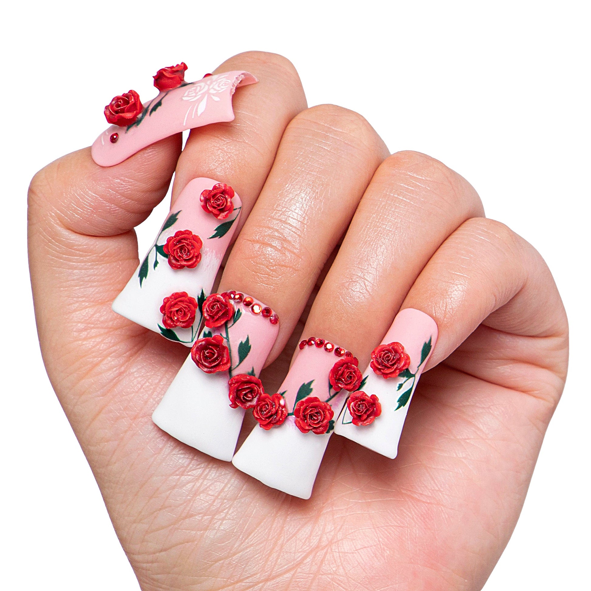 A bold yet elegant take on floral nails, this design features a dramatic black-to-nude ombr¨¦ base, adorned with vibrant red 3D roses. Delicate silver leaf accents and small red gem embellishments add just the right amount of detail, making this set both striking and sophisticated. A perfect choice for those who love a little edge while keeping it Vintage-Chic.