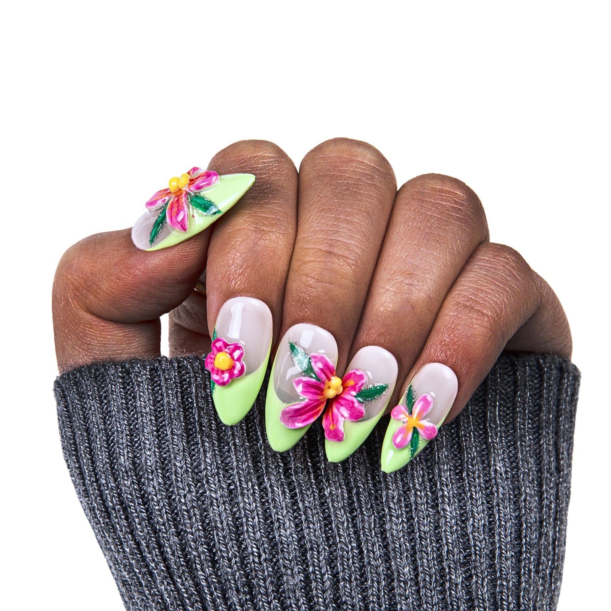 A bold and vibrant mix of fuchsia pink 3D flowers set against a fresh green gradient base,? embodying the lively energy of spring. Each petal is sculpted with precision, creating a lush, garden-inspired look perfect for those who love statement nails.