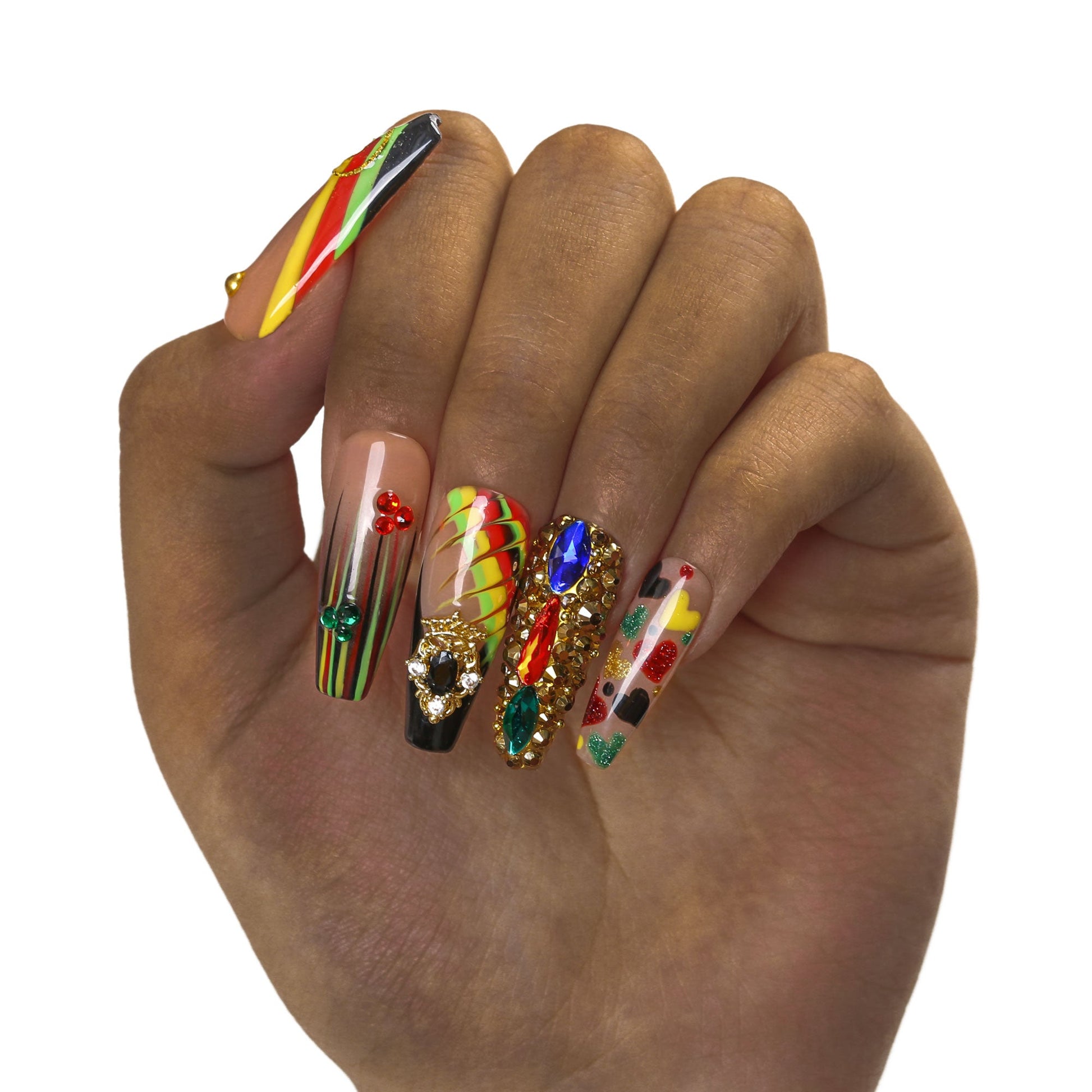 Celebrate strength, wisdom, and unity with nails that celebrate Juneteenth and The Culture!! These stunning beauties are not only captivating with shine. They also represent a rich history that's deeply rooted in pride, love, and resilience. Beautiful and bold, vibrant and vivacious, this set captures the essence of celebrating Juneteenth, celebrating The Culture!!!!