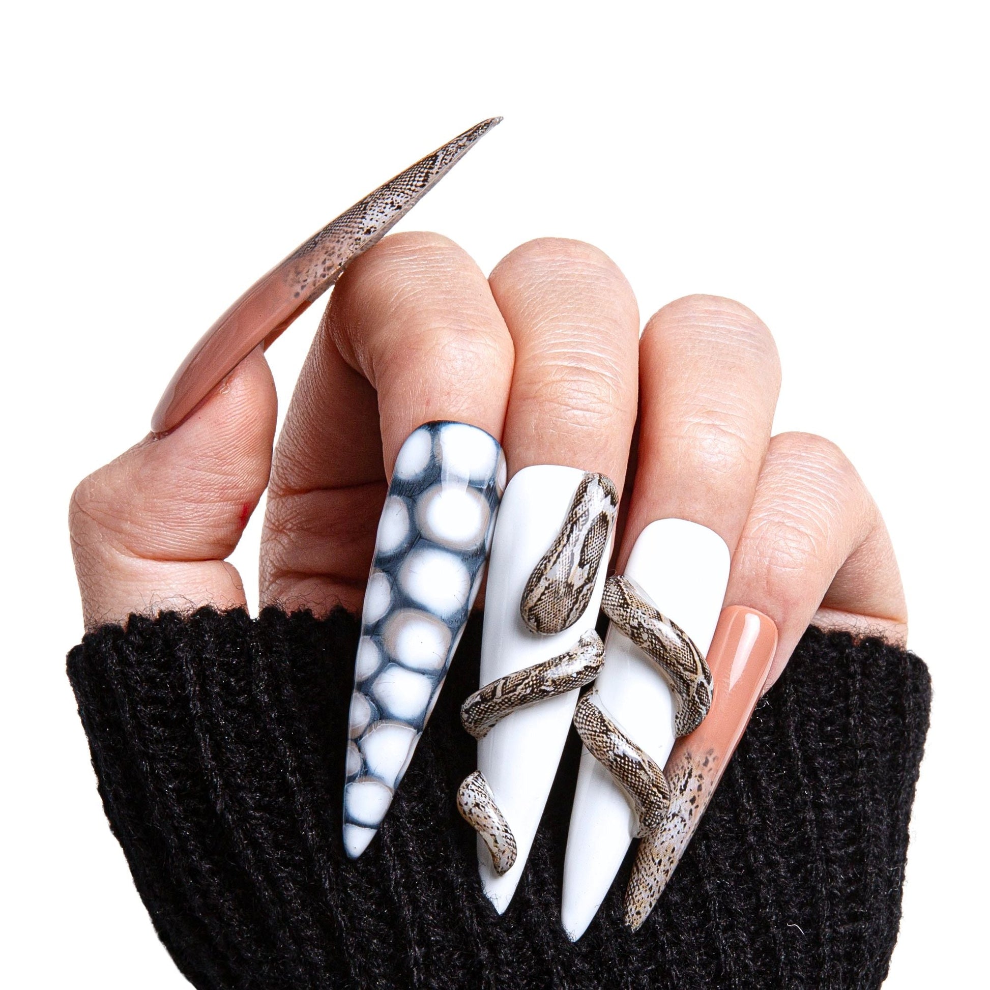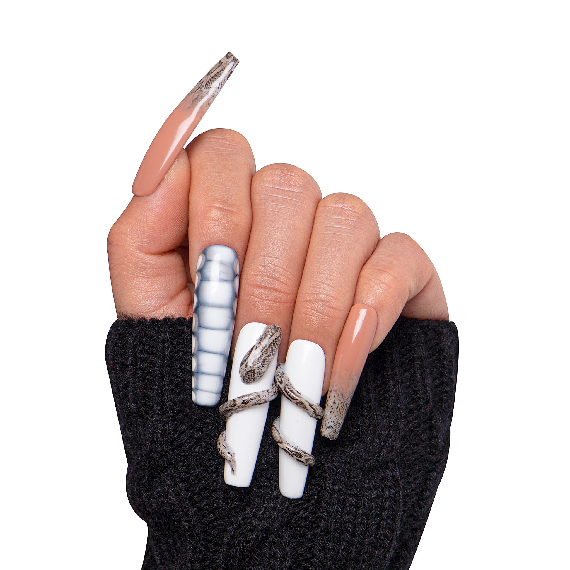 Unveil the beauty of the desert with 'Sahara,' our press-on nail set that captures the essence of the sands. Featuring a pure white base with a subtle sand effect, this collection brings the exotic vibes of the Sahara desert to your nails. The intricate snake design adds a touch of wild elegance, making it a unique and striking choice.