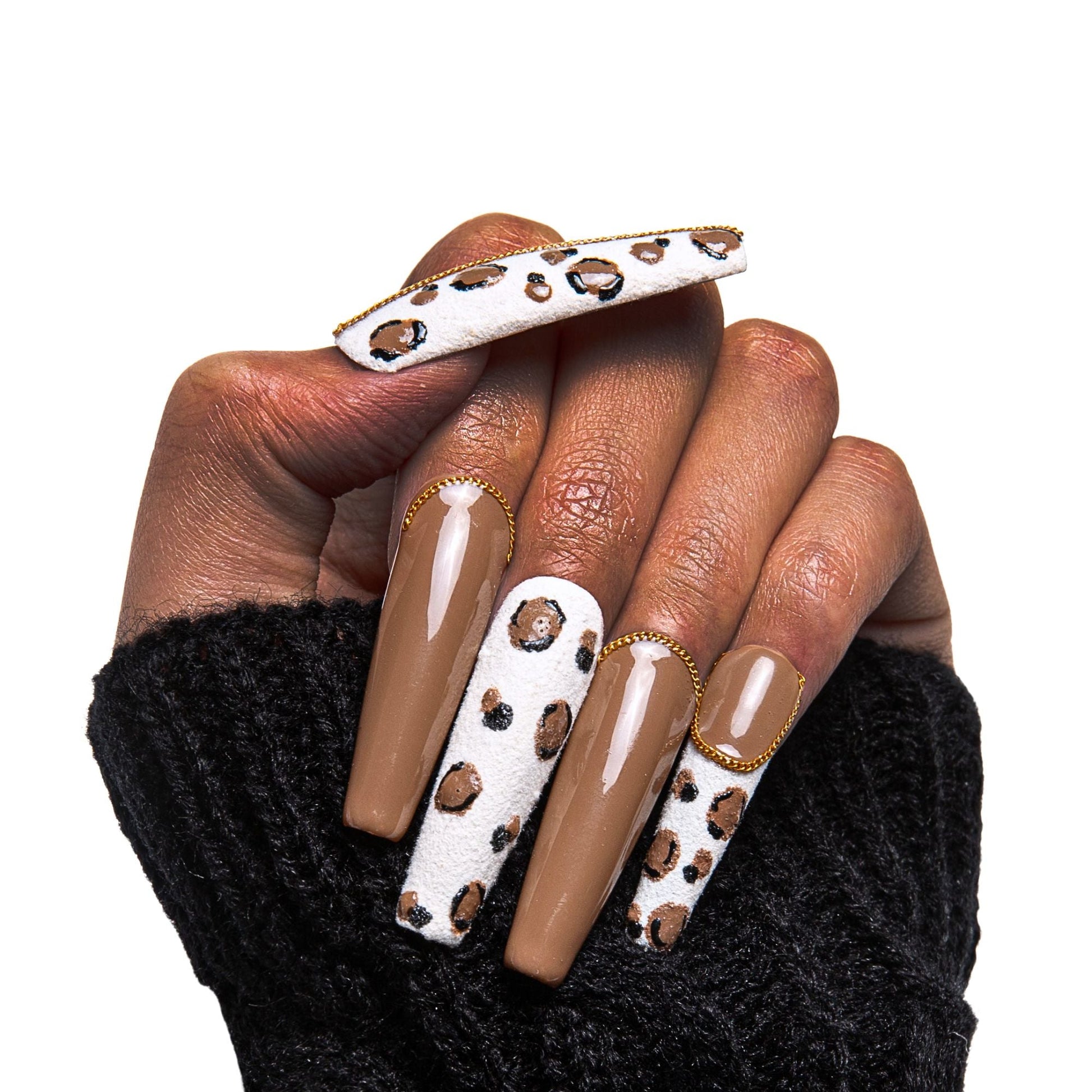 Delve into decadence with the luscious mocha hue, exuding warmth and charm with every glance. But what truly sets these nails apart is the special texture leopard print, adding a touch of wild elegance to your fingertips. Whether you're savoring a candlelit dinner or strolling through afternoon cafe, these nails embody extreme elegance.