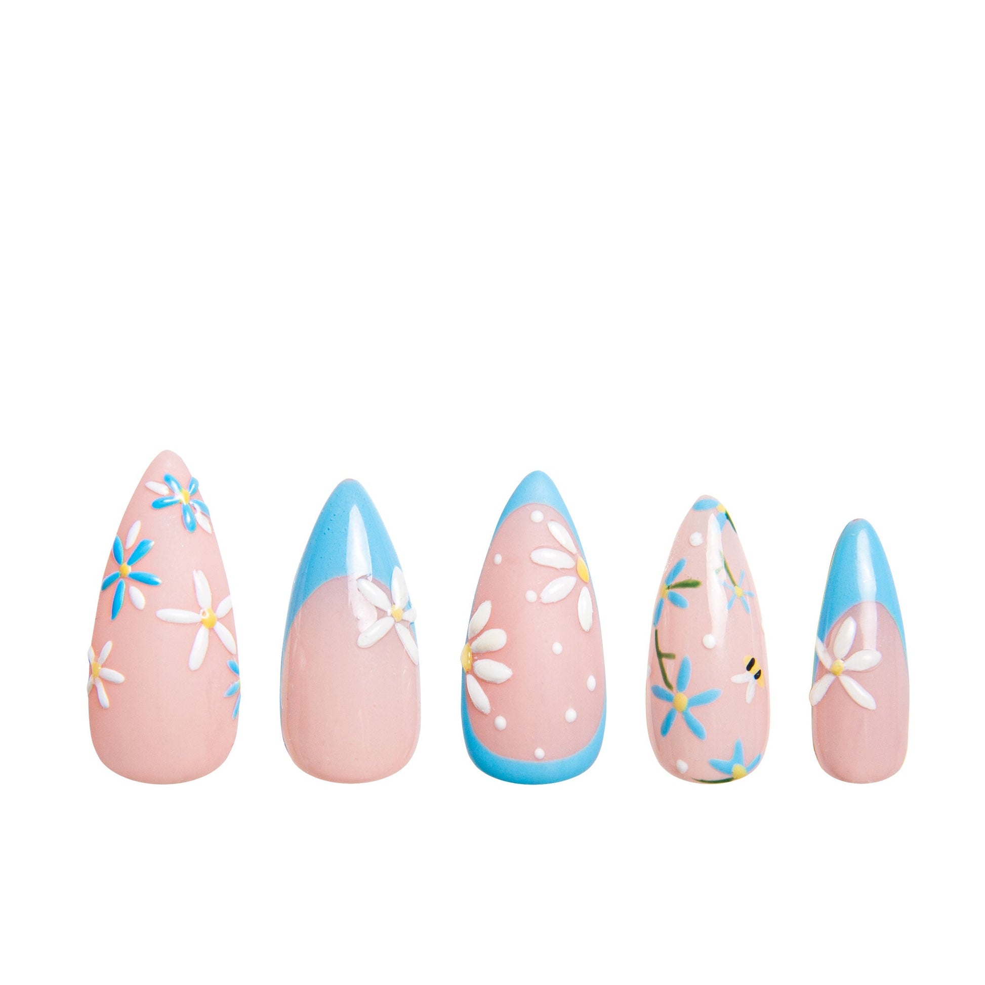A fresh and airy design inspired by clear spring days and blossoming meadows. Featuring soft pink and sky-blue French tips, delicate hand-painted daisies, and playful polka dots, this set captures the essence of sunshine and floral charm. A hint of golden accents and buzzing bees adds a touch of whimsy, making this the perfect set for welcoming the season.