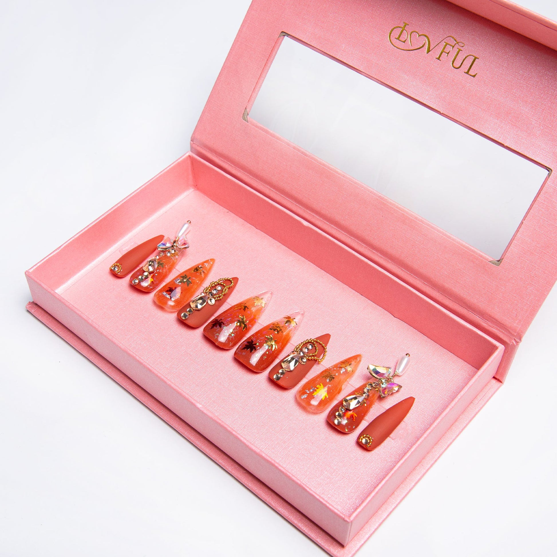 Experience the cozy warmth of autumn hues combined with the delicate elegance of nature's beauty. Our press-on nails are a stunning gradient of golden orange and yellow, reminiscent of the breathtaking colors of fall foliage. Each set includes intricately crafted maple leaf decors and gentle gemstone shapes, adding a seasonal charm to your fingertips. Whether you're hosting a harvest dinner with loved ones, attending a picturesque autumn wedding, or simply wanting to embrace the enchanting spirit of fall, our "Fall" nails are the perfect accessory. Let your fingertips reflect the vibrant and radiant beauty of the season with our "Fall" press-on nails.