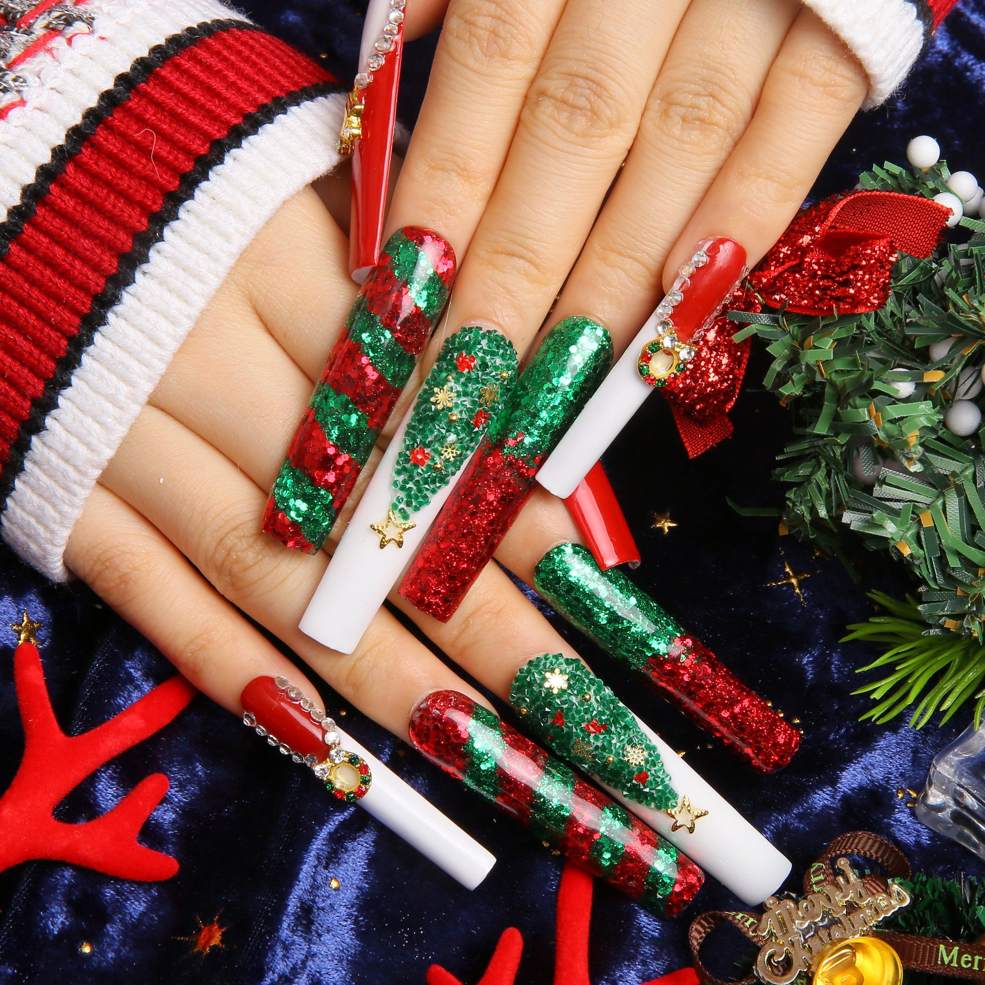 Ho! Ho! Ho! Celebrate this Merry Christmas with H78, featuring festive bell decorations and garnet designs. Each nail is handmade with delicate sugar crystals shaped like a Christmas pine tree, adorned with carefully placed snowflake decorations. Embrace the spirit of the season with joyful red and green colors, and add a touch of holiday magic to your fingertips!