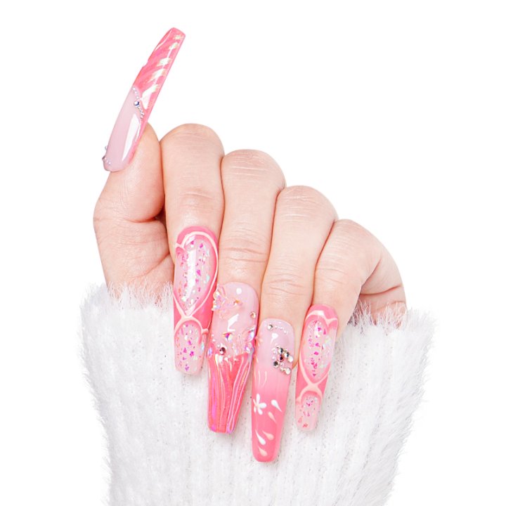 Pink Fantasy is a set of stunning press - on nails that embody the essence of femininity and charm. The nails feature a beautiful gradient of soft pink hues, creating a dreamy and romantic look. Each nail is intricately designed with shimmering glitter and delicate floral patterns, adding a touch of elegance and fantasy. These press - on nails are perfect for those who want to achieve a glamorous and sophisticated nail art look effortlessly. Whether it's for a special occasion or everyday wear, Pink Fantasy is sure to make your hands stand out with its enchanting design.