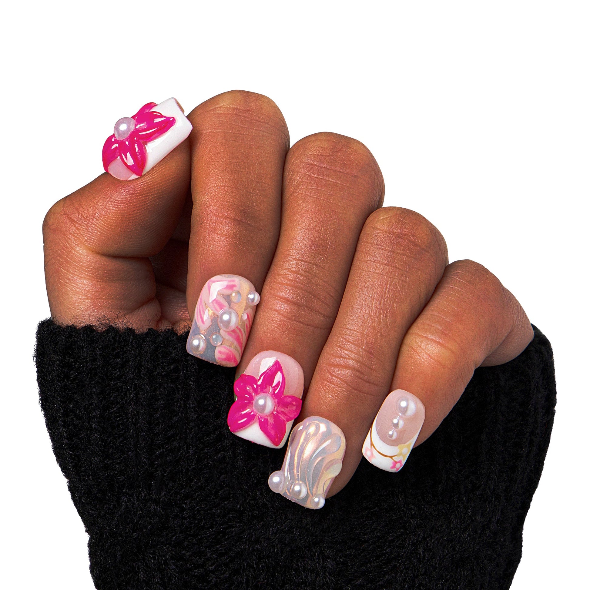 Hawaiian Orchid is a delightful fashion statement. They feature a charming design with elegant white bases, adorned with soft pink and white swirling patterns. The nails are further embellished with cute pink flower decorations and small pearl - like accents, creating a look that is both stylish and whimsical.
