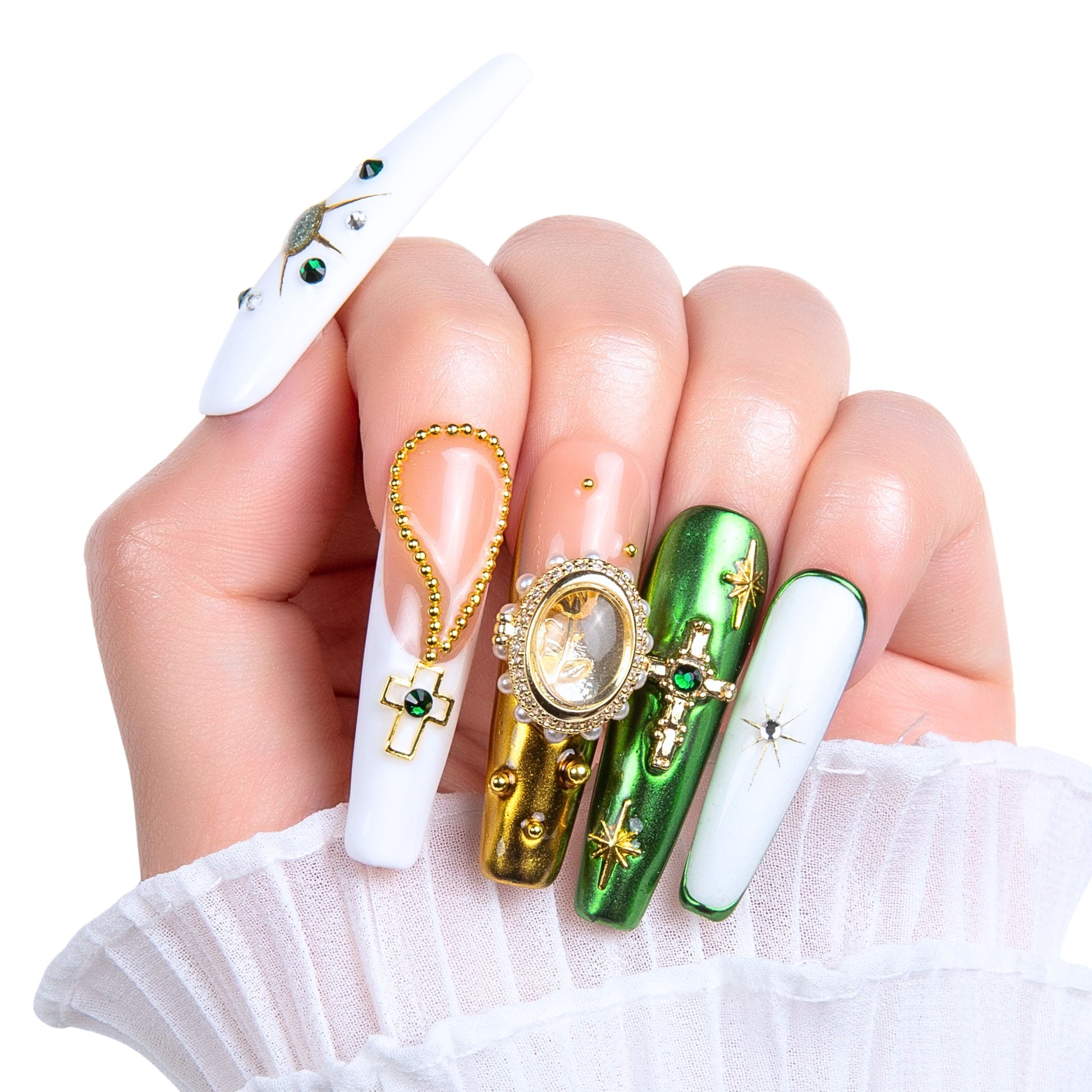 Radiate an angelic aura with our new Holy Glamour.This luxurious design features a combination of white, gold, and green, reminiscent of a heavenly?garden. Each nail is adorned with delicate jewels, pearls, and crosses, creating a look that is both?elegant and ethereal.