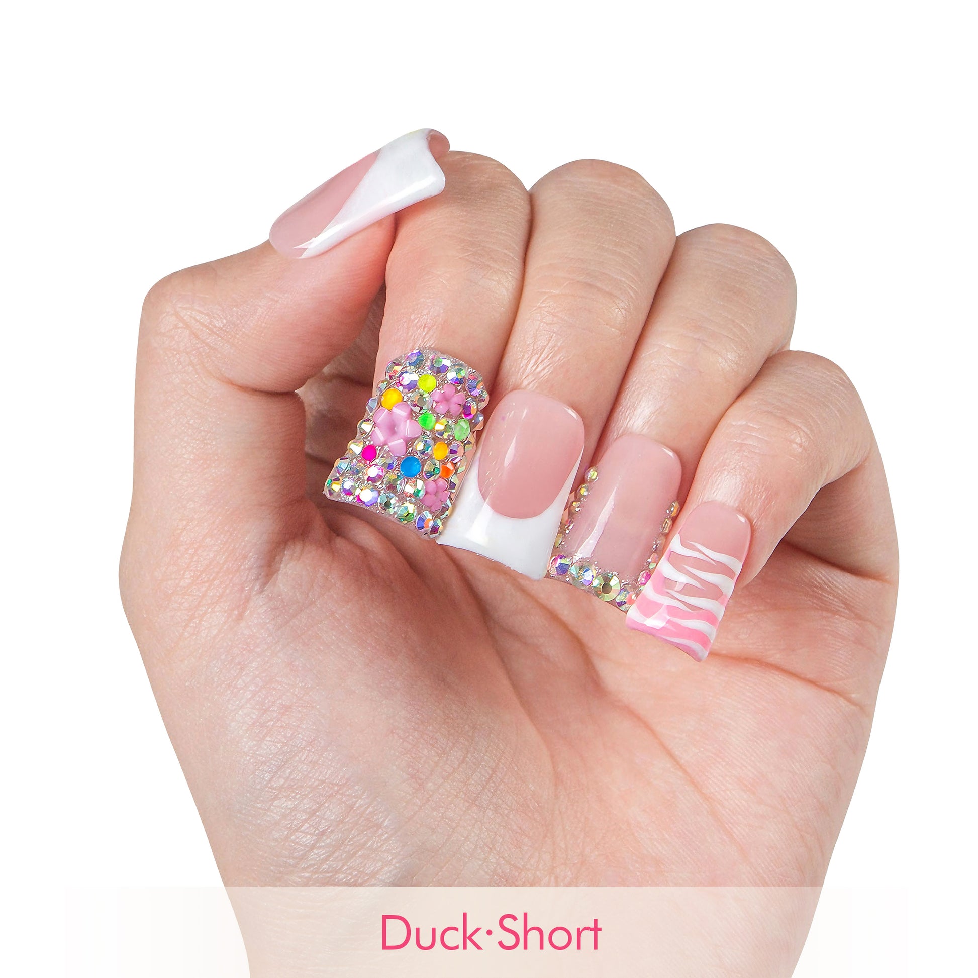 Kiss Me in Kawaii is pure sweetness with baddie-level detail. This hyper-cute set brings together pink zebra accents, bold French tips, rainbow rhinestones, and 3D floral sparkle. It’s playful, pastel, and unapologetically extra—made for the girls who grew up on glitter, never stopped loving pink, and believe more sparkle is always the answer.