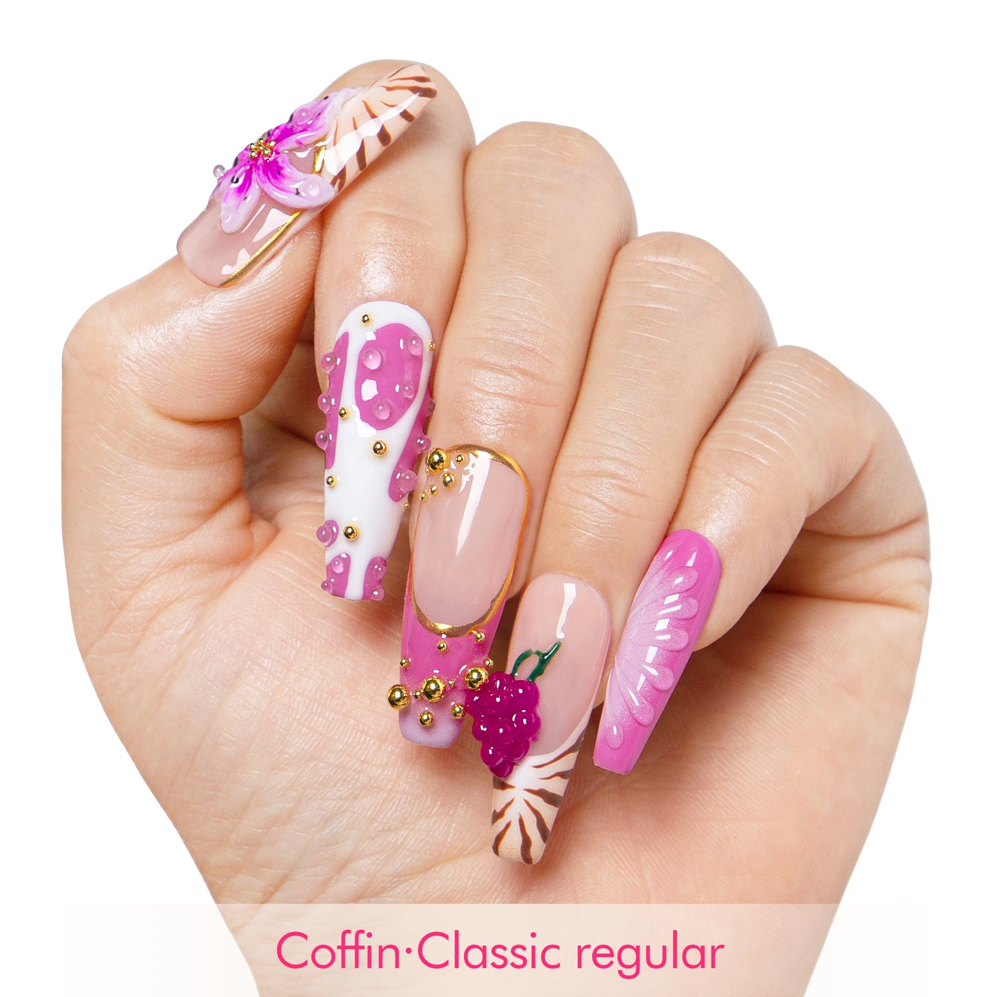 A soft summer romance told in petals and shimmer. La Vida Rosé mixes sculpted 3D florals, rosewater hues, golden beads, and translucent waves. These nails bloom like love letters, soft, tropical, and a little indulgent.