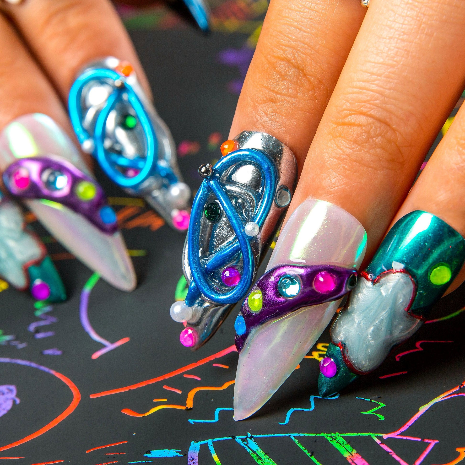 Steel silver melts into midnight chrome, lit by flashes of neon pink, green, and tangerine. Wavy chrome coils dance across the nails like dream circuits. Nebula Noir is a surreal escape into a glam tech fantasy ¡ª retro-futuristic and ultra bold.