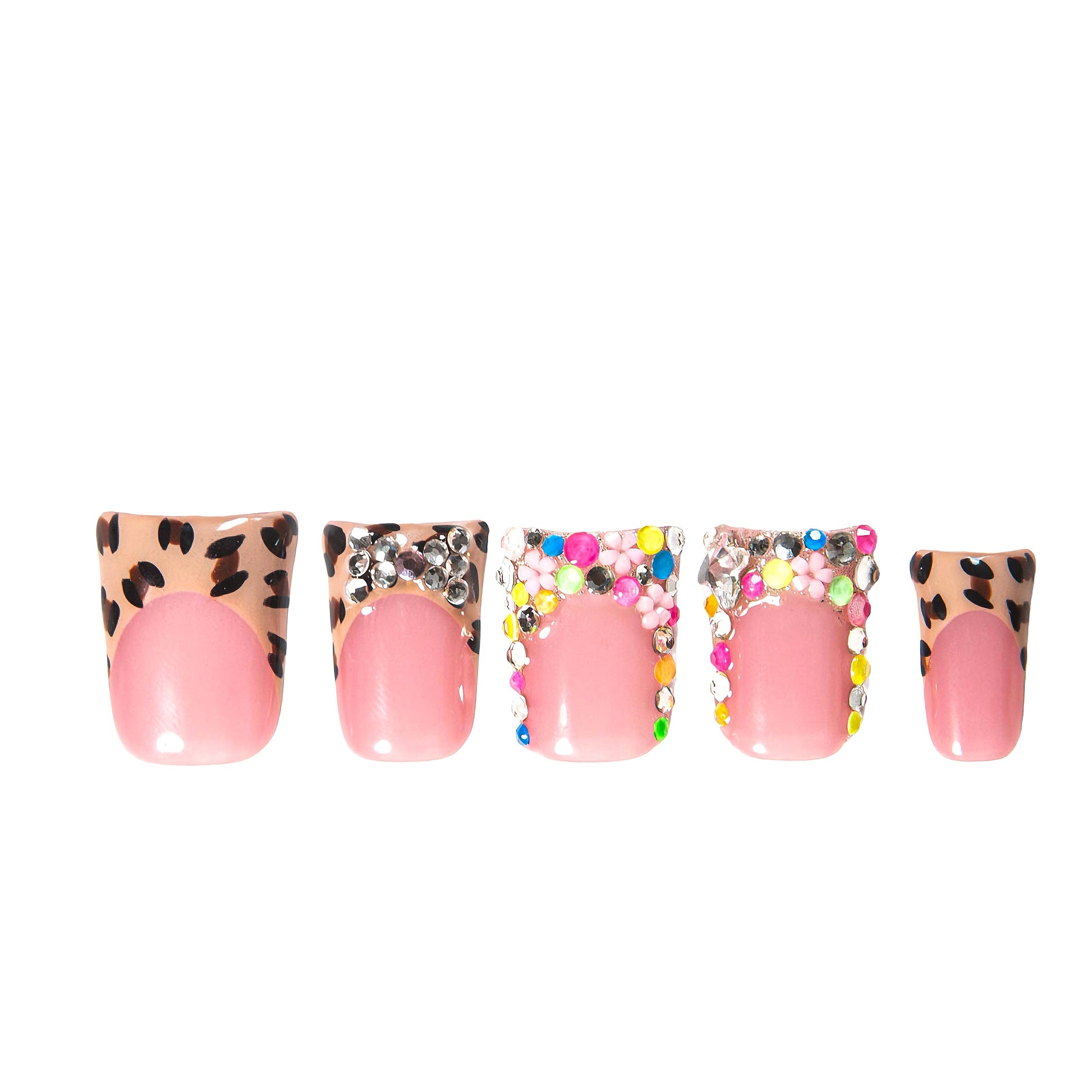 She¡¯s pink, polished, and knows exactly what she¡¯s doing. Pretty Please is for the girls who ask nicely but always get what they want. This glossy set features flirty leopard print French tips paired with high-shine rhinestones,neon gems and the perfect baby pink base that says ¡°I¡¯m sweet but don¡¯t test me¡±
