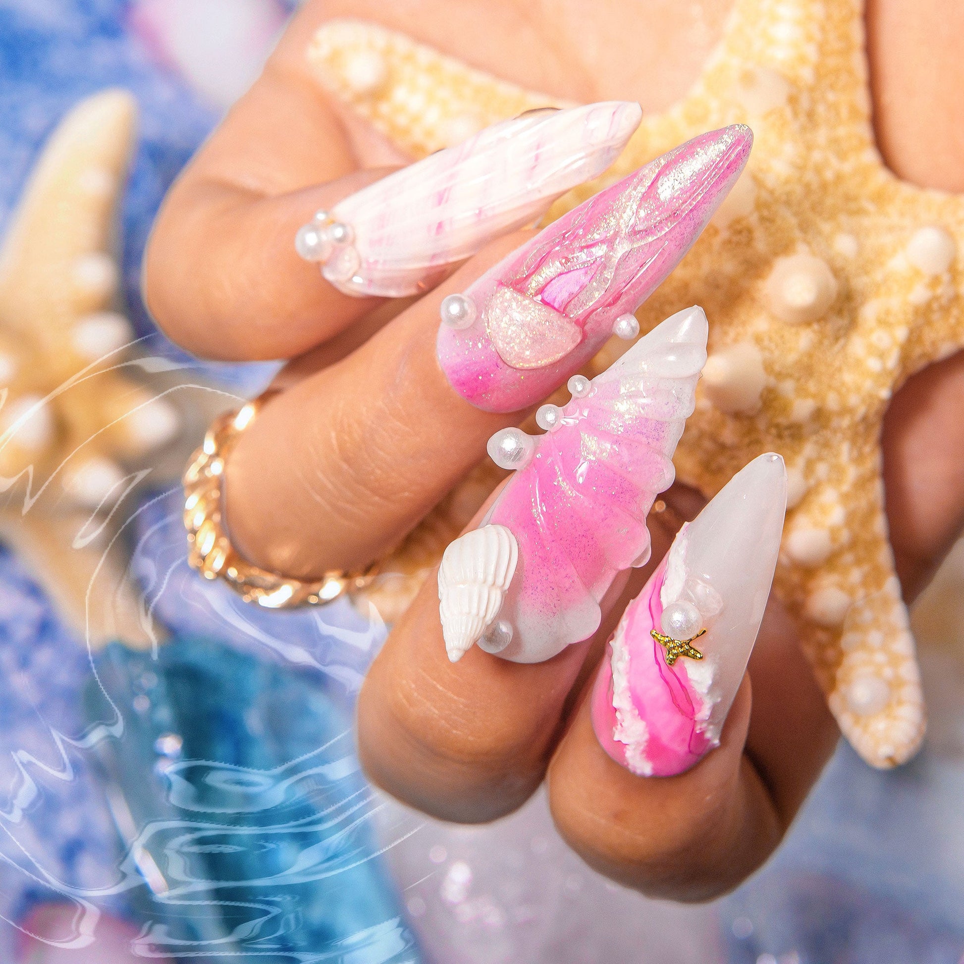 Playful, bold, and a little mysterious,Seashell Siren captures the sweet side of deep sea glam. This set blends bubblegum pink swirls with ocean pearls, golden starfish, and even a tiny jellyfish, like a sugary daydream floating just under the tide. It¡¯s made for tropical getaways, hot girl summers, and the beach babe who always stands out.