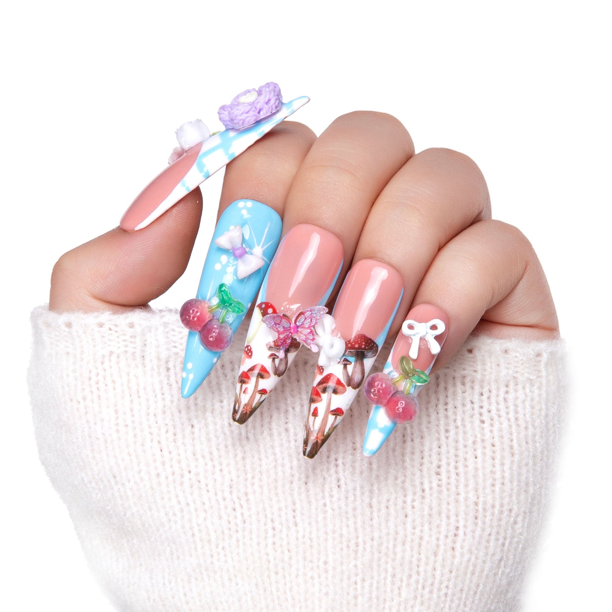 Secret Garden is charming with girlish designs. It features pink and blue colors, and each has unique decorations like cartoon characters, flowers, bows, and pearls. They offer various styles for different nail shapes and lengths, suitable for daily and special occasions. They are convenient to use, ideal for those who like to change nail styles often.