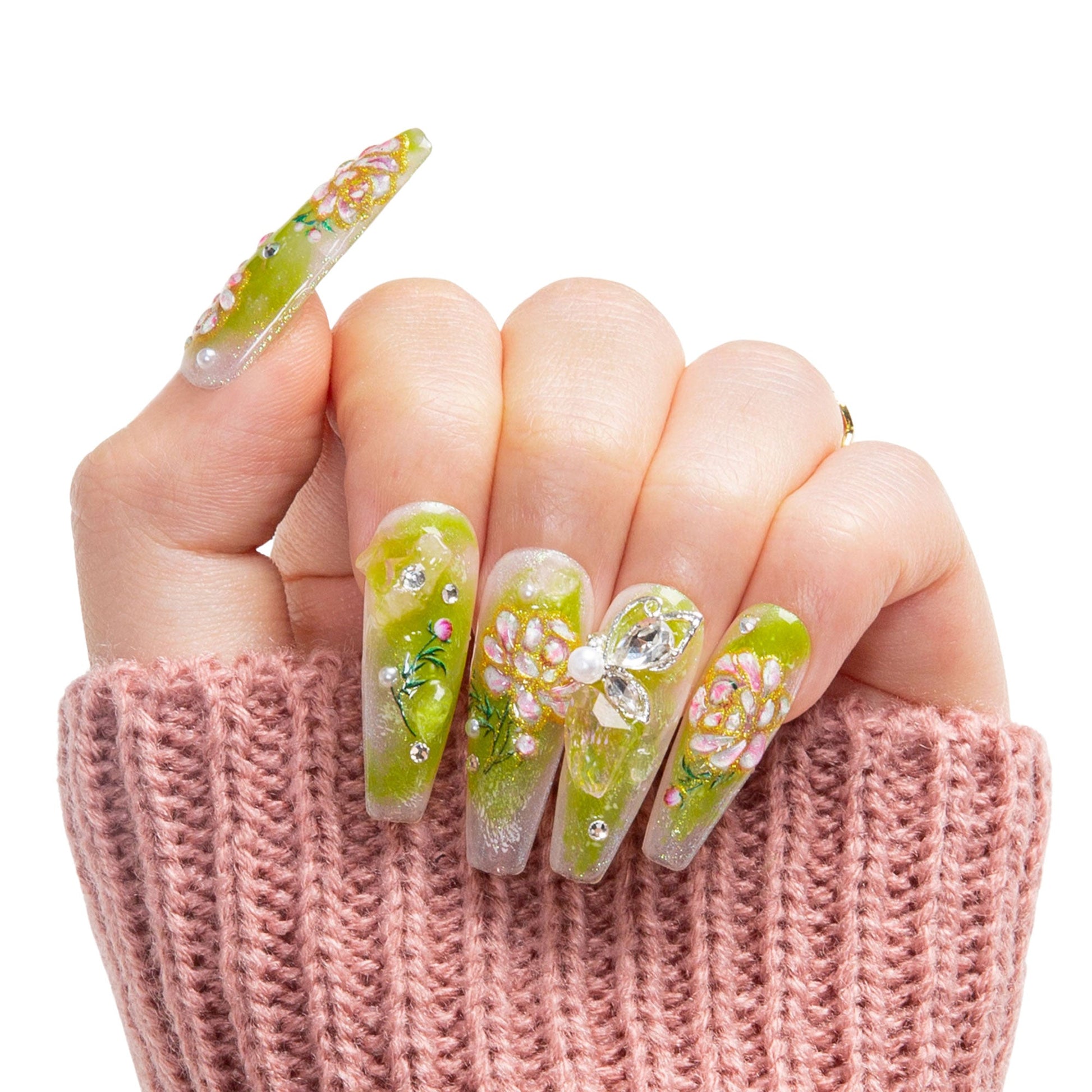 A soft blend of honeyed yellow and fresh meadow green forms the perfect canvas for delicate hand-painted pink florals while elegant metallic bows add a touch of antique charm. Whether you¡¯re sipping tea in a countryside cottage or wandering through fields of wildflowers, these nails will have you feeling like you¡¯ve stepped into an old-world fairytale.