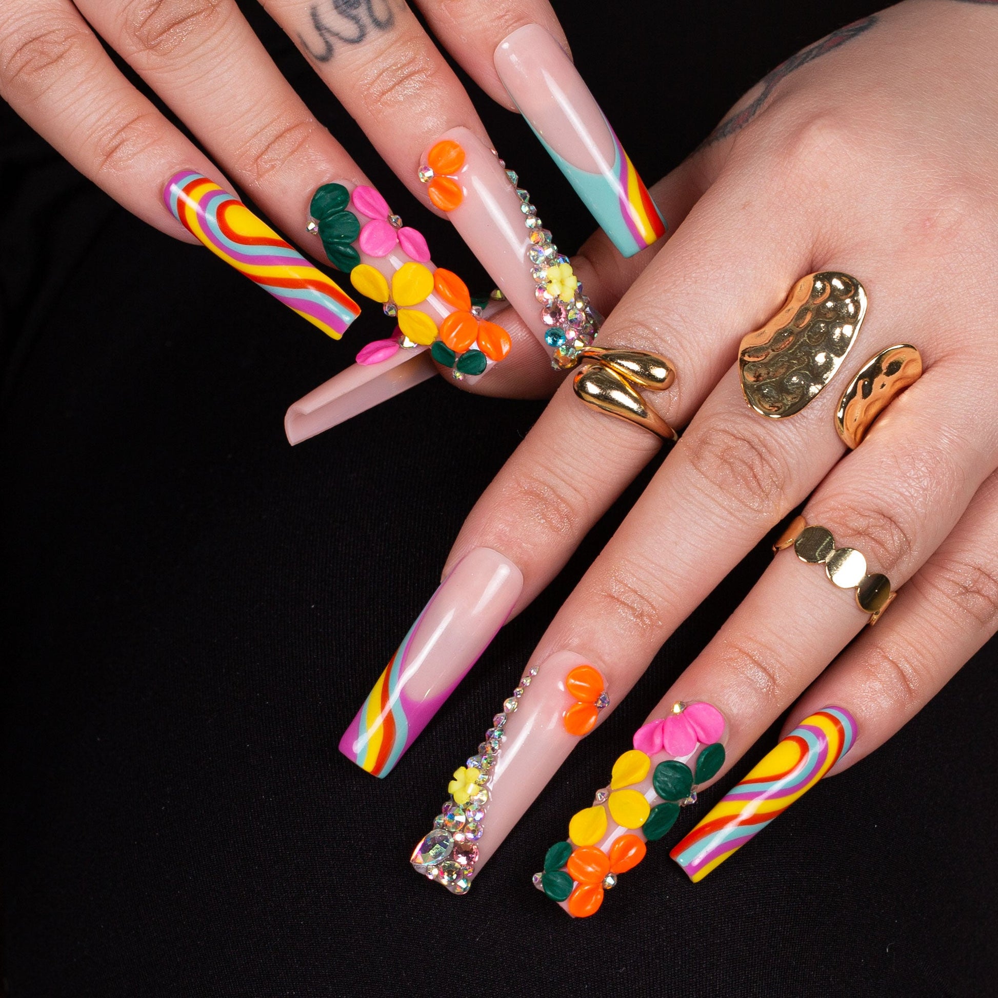 The ultimate acrylic press-on nail that¡¯s designed to turn heads. Meet Spring Bliss, This dazzling set is a perfect fusion of bold colors, playful details, and intricate embellishments bringing the essence of spring right to you. With a sophisticated soft nude base that sets the stage for vibrant rainbow swirls in pink, yellow, orange and blue, creating a playful yet elegant contrast. Delicate 3D floral embellishments in cheerful hues bring a fresh, garden-inspired charm, while dazzling rhinestones catch the light with every movement, adding the perfect touch of sparkle.