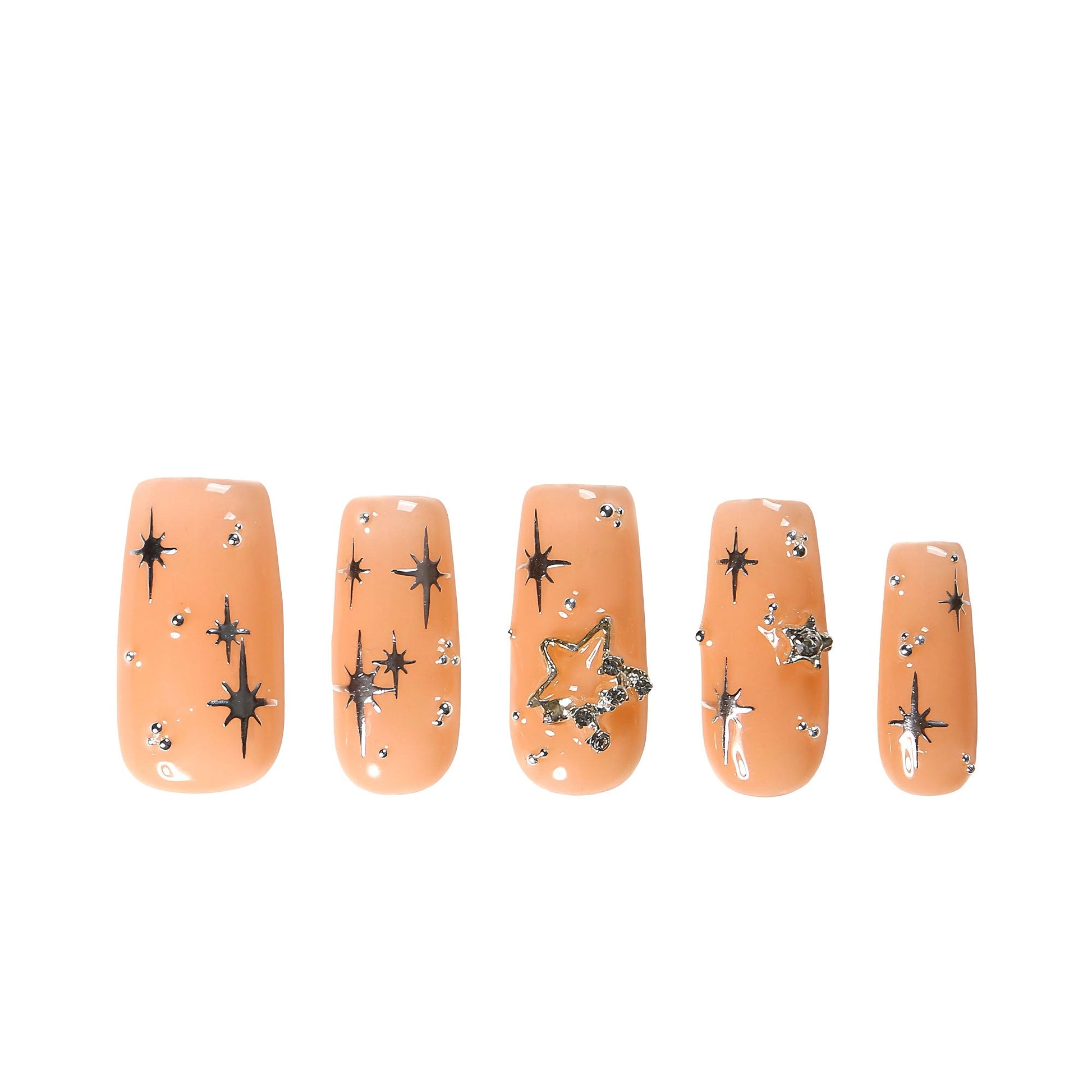 Our Starlit Wish press-on nails feature a soft nude base with reflective silver star decals and dazzling rhinestones ¨C creating a celestial glam look that's both magical and elegant. Whether you're heading to a party, date night, or just want to shine a little brighter, these nails make it effortless.