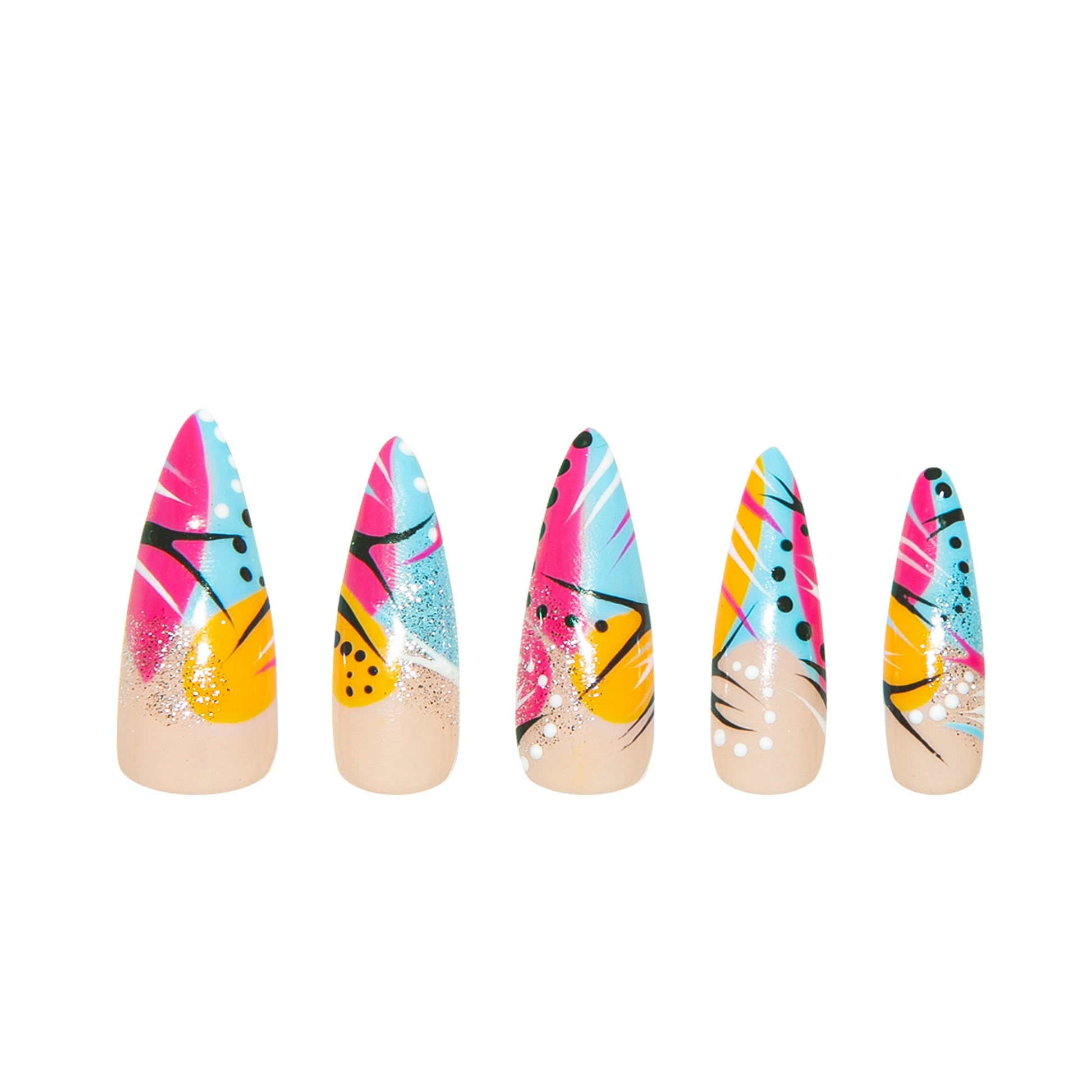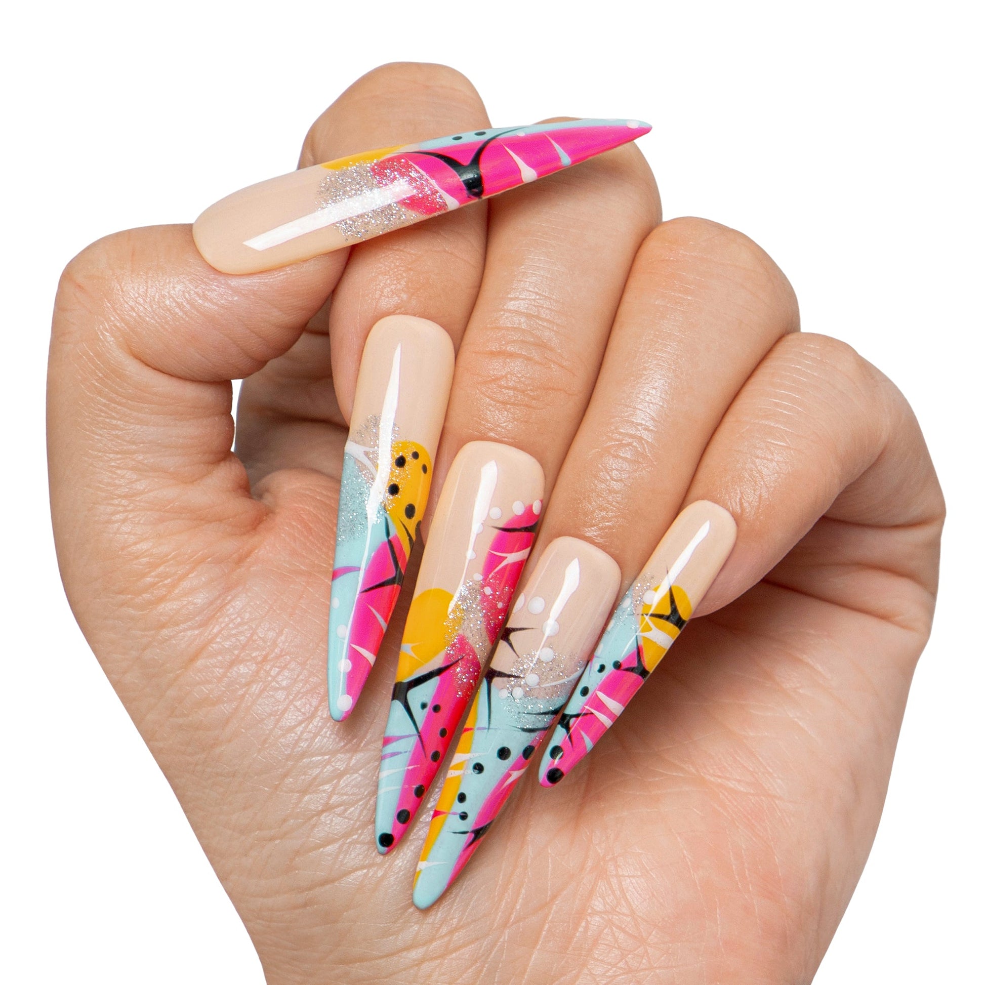 Tropical Paradise Turn up the heat with this tropical explosion of color! These bold nails feature a stunning blend of hot pink, ocean blue, tangerine orange, and a touch of glittery silver for that radiant summer shine. With sharp black accents, dot detailing, and dynamic white swirls, each nail looks like a tiny masterpiece. Whether you're headed to a beach party or just want to serve a look, these nails are guaranteed to turn heads. Be Bold,Bright,Unapologetically YOU!