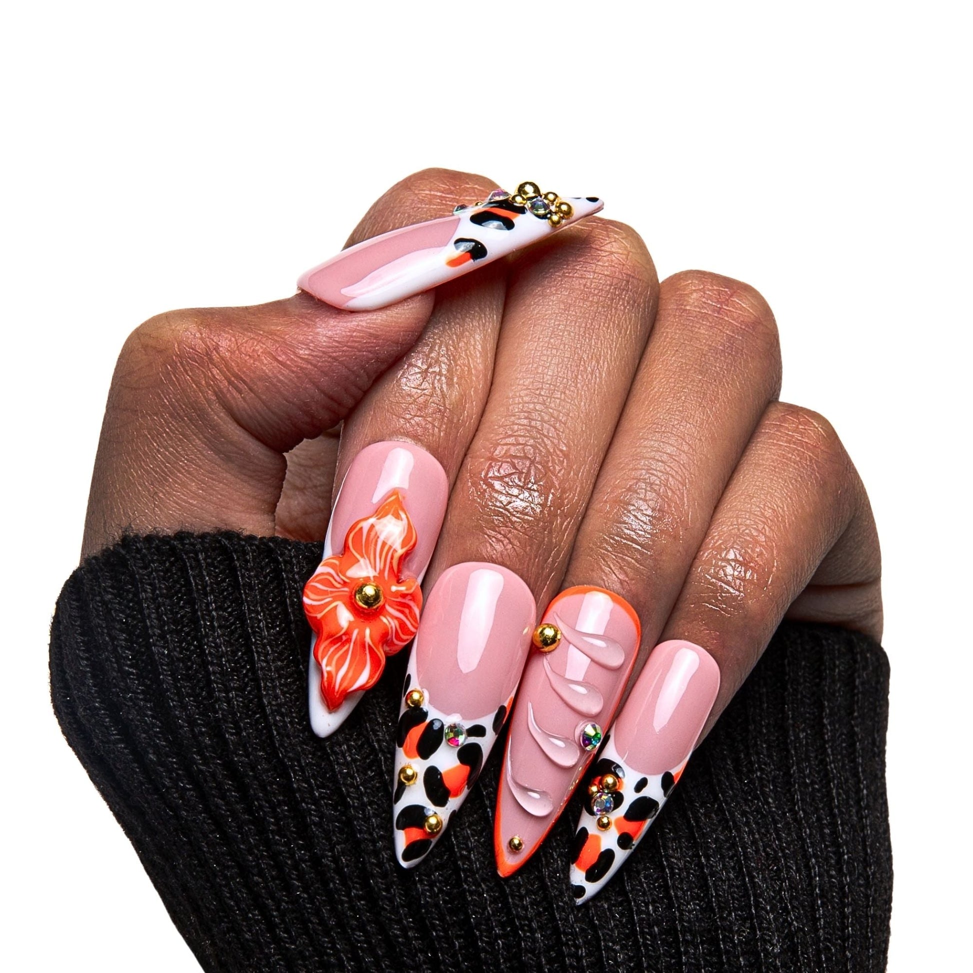 Introducing "Tropical Sunset" a bold and captivating nail design that's perfect for making a statement! This set features a soft nude-pink base that keeps it elegant and versatile. The tips are adorned with black and orange leopard print, adding a touch of wild sophistication. For an eye-catching accent, there's a beautiful 3D orange flower that brings tropical vibes to life. One of the nails showcases soft orange gradient swirls, inspired by the beauty of a serene sunset. To top it all off, gold studs and sparkling iridescent crystals add the perfect amount of glam and shine.