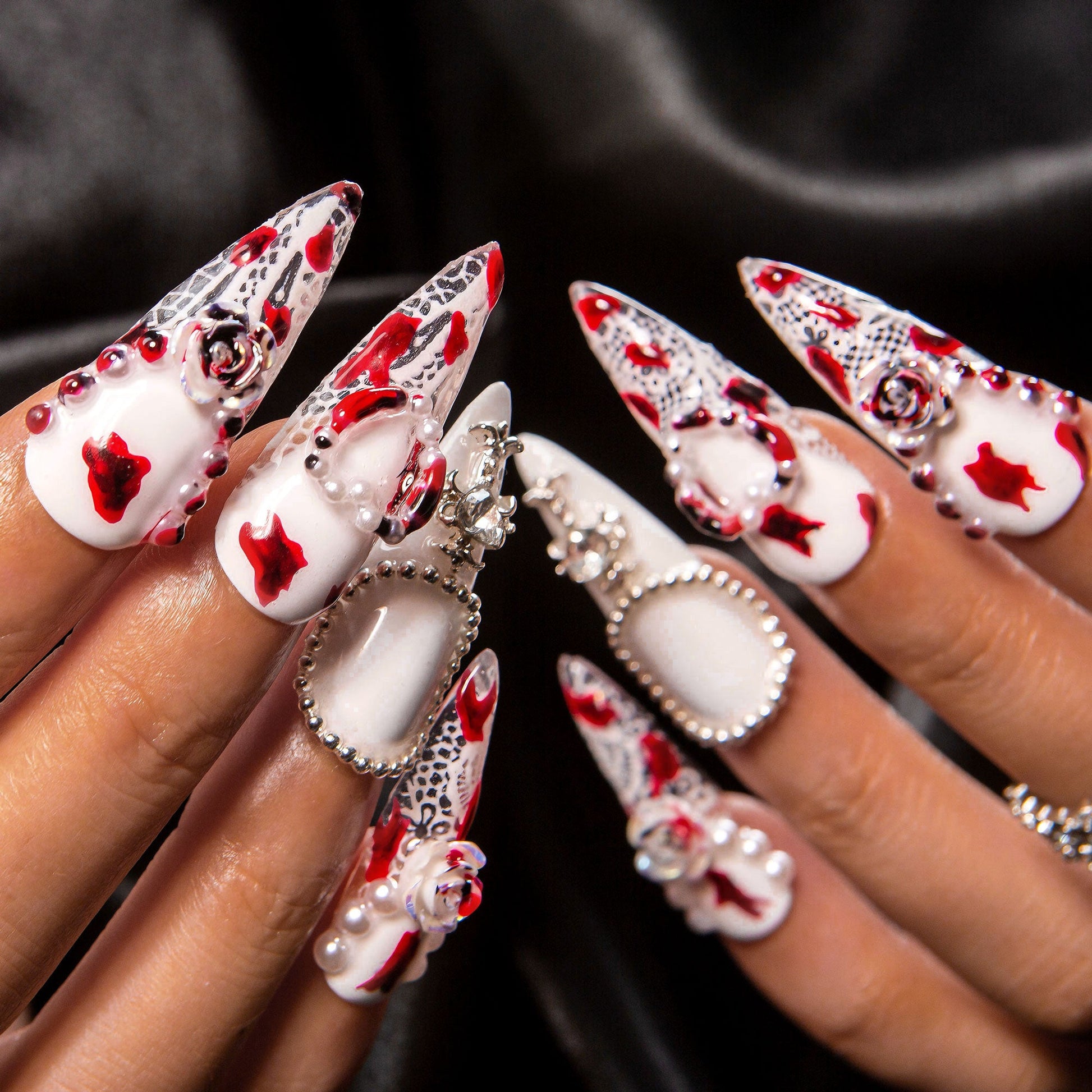 Step into the spotlight with Velvet Blood, a fierce press-on nail set that fuses gothic drama with high-fashion detail. Featuring sculpted roses, deep red drip accents, and intricate lace patterns, each nail is finished with luxe 3D charms, pearls, and metallic frames. Handcrafted to captivate ¡ª whether you're serving vampire glam or high-gloss couture.