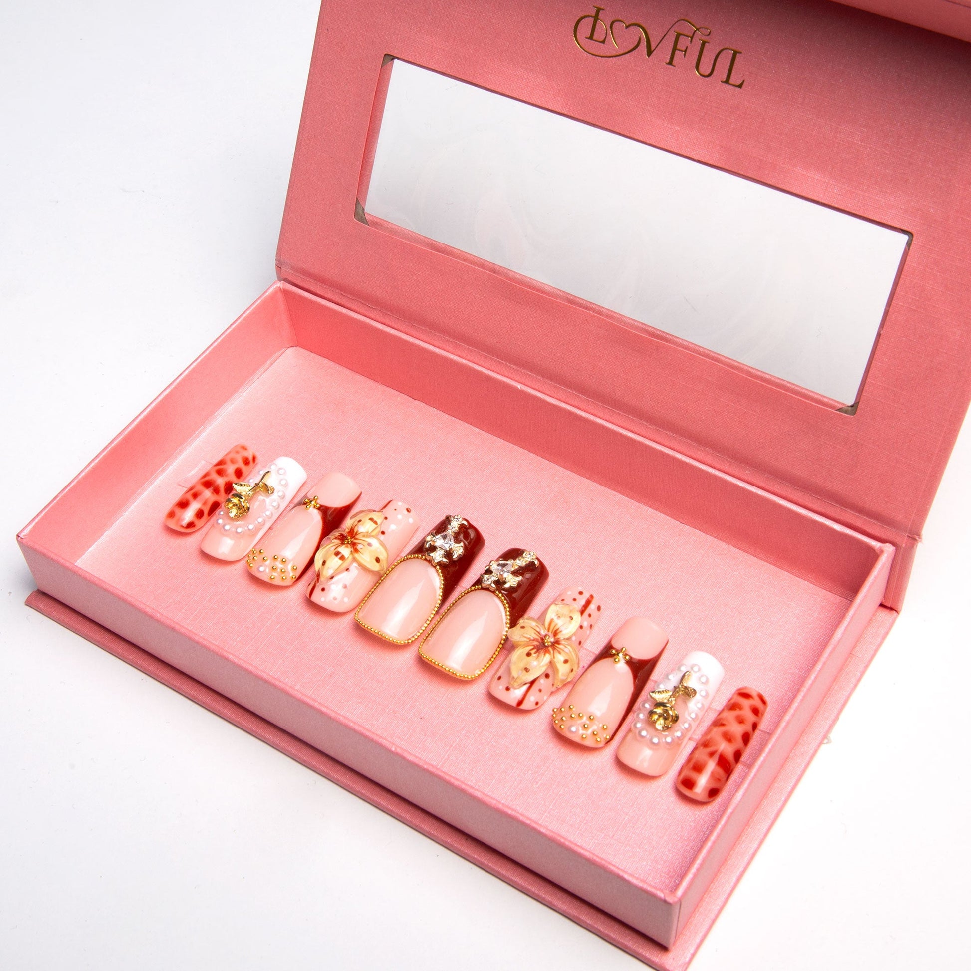 Step back in time with our Vintage Boho Chic press on nails.Inspired by the charming elegance of a bygone era, these nails feature a stunning combination of a soft blush nude and rich mahogany accents creating a captivating contrast. Adorned with delicate 3D flowers, shimmering pearls and elegant gold detailing. These press ons are the perfect romantic evening, special occasion or to simply elevate your everyday style.